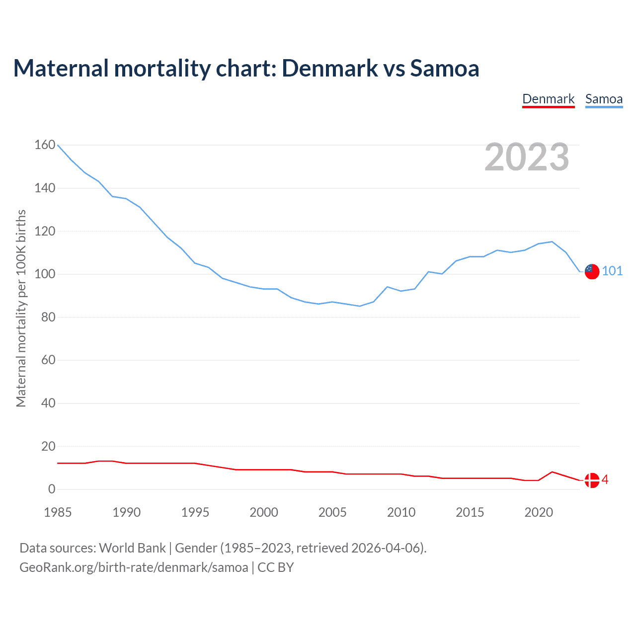The maternal mortality rate, which is the probability of dying during childbirth or within 42 days of pregnancy termination, is 4 deaths per 100,000 live births in Denmark, compared to 101 deaths in Samoa.