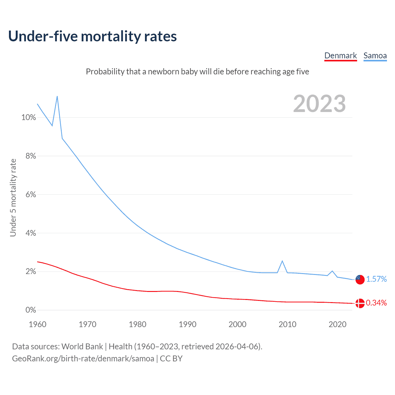 The chance that a newborn baby will die before reaching age five is 0.34% in Denmark and 1.57% in Samoa. Above is a chart with historical data on under-five mortality rates.