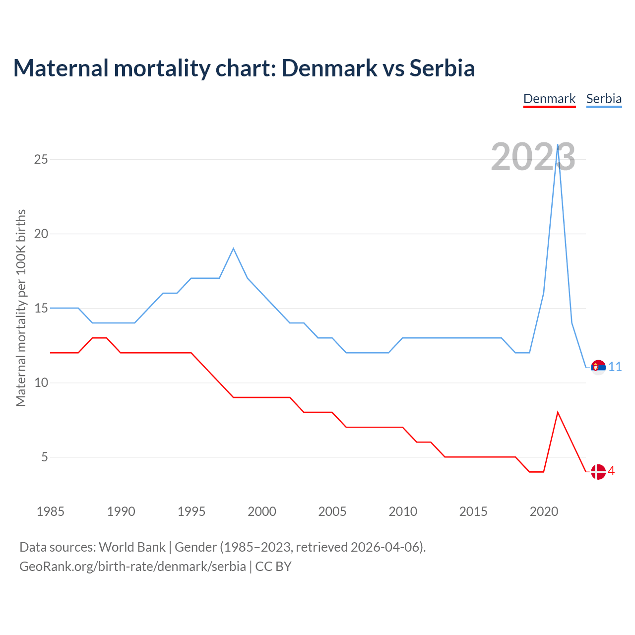The maternal mortality rate, which is the probability of dying during childbirth or within 42 days of pregnancy termination, is 4 deaths per 100,000 live births in Denmark, compared to 11 deaths in Serbia.