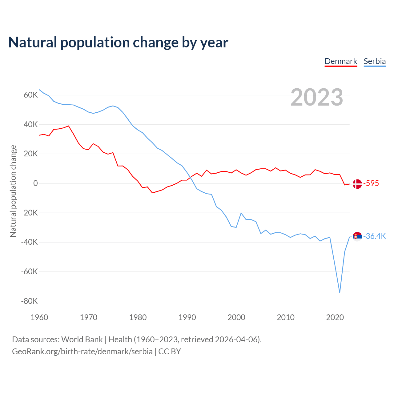 According to the latest available data on birth rates, the fertility rate in Denmark was 1.5 children per woman in 2023, compared to 1.61 in Serbia in 2023. The replacement level is considered to be 2.1 children per woman.