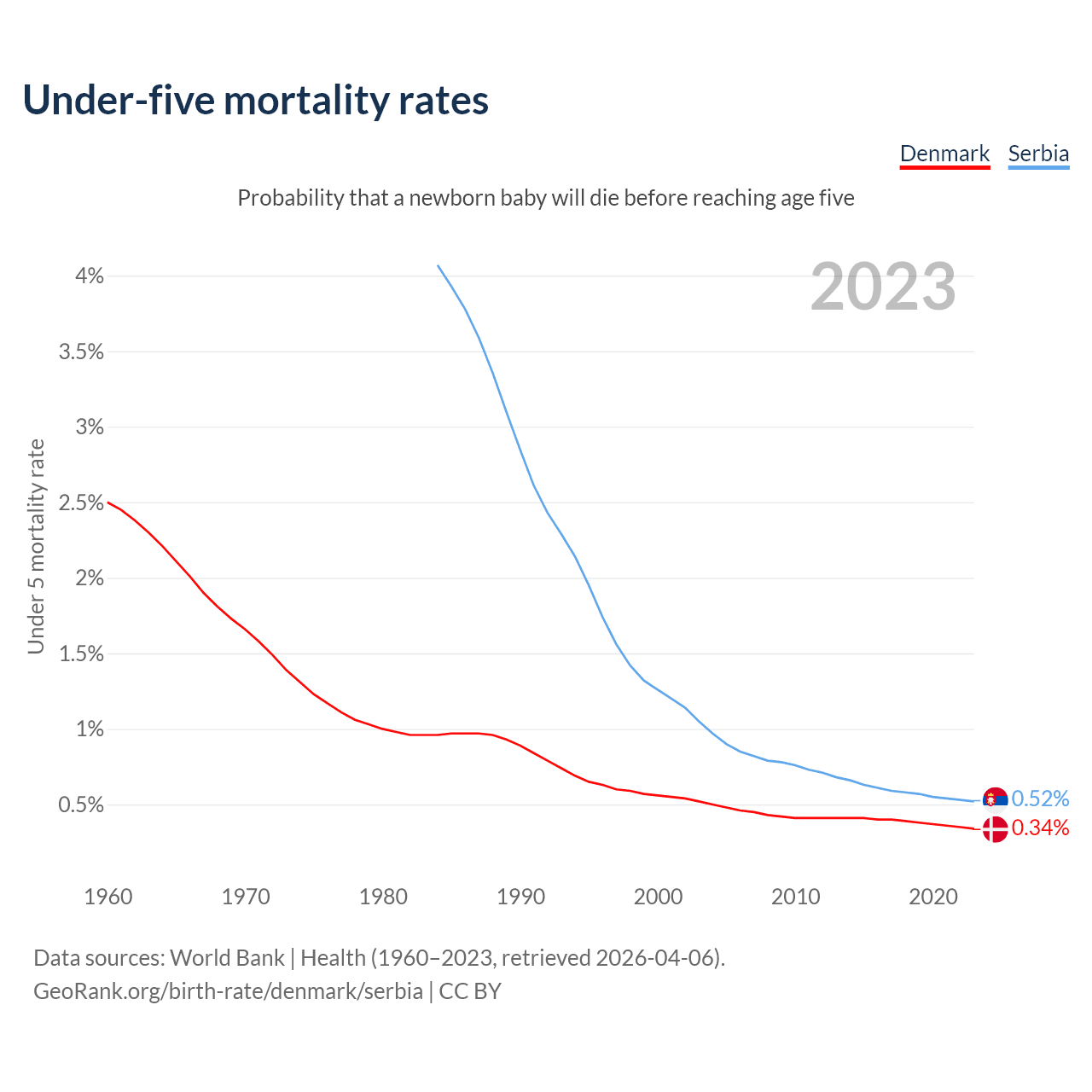 The chance that a newborn baby will die before reaching age five is 0.34% in Denmark and 0.52% in Serbia. Above is a chart with historical data on under-five mortality rates.
