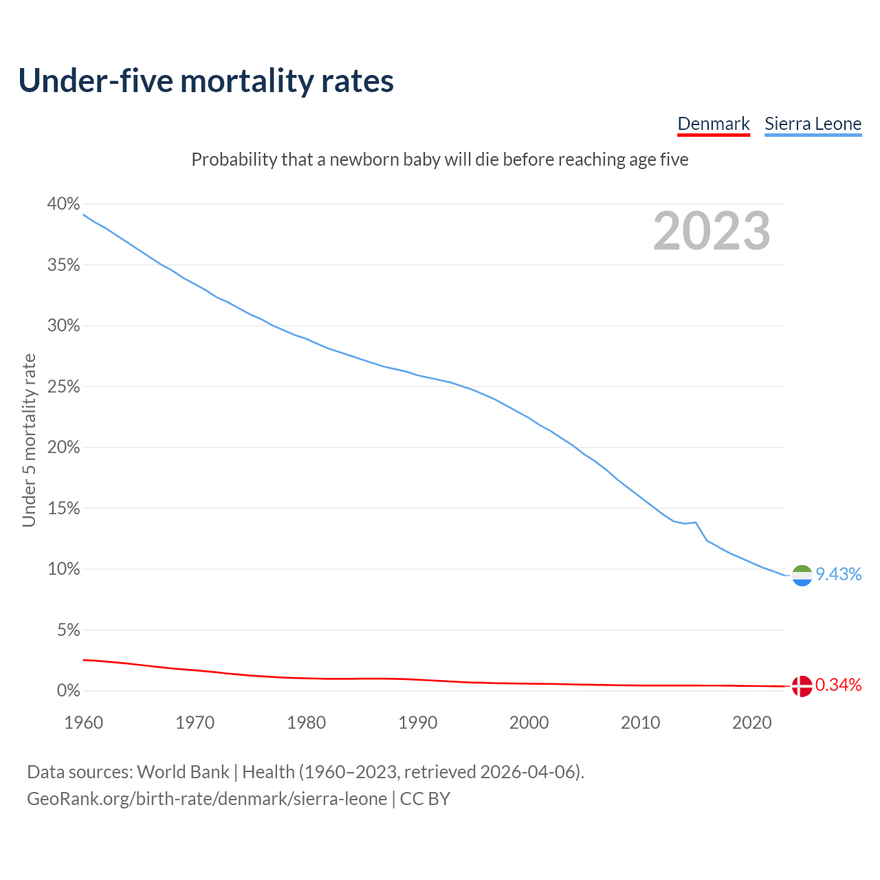 The chance that a newborn baby will die before reaching age five is 0.34% in Denmark and 9.43% in Sierra Leone. Above is a chart with historical data on under-five mortality rates.