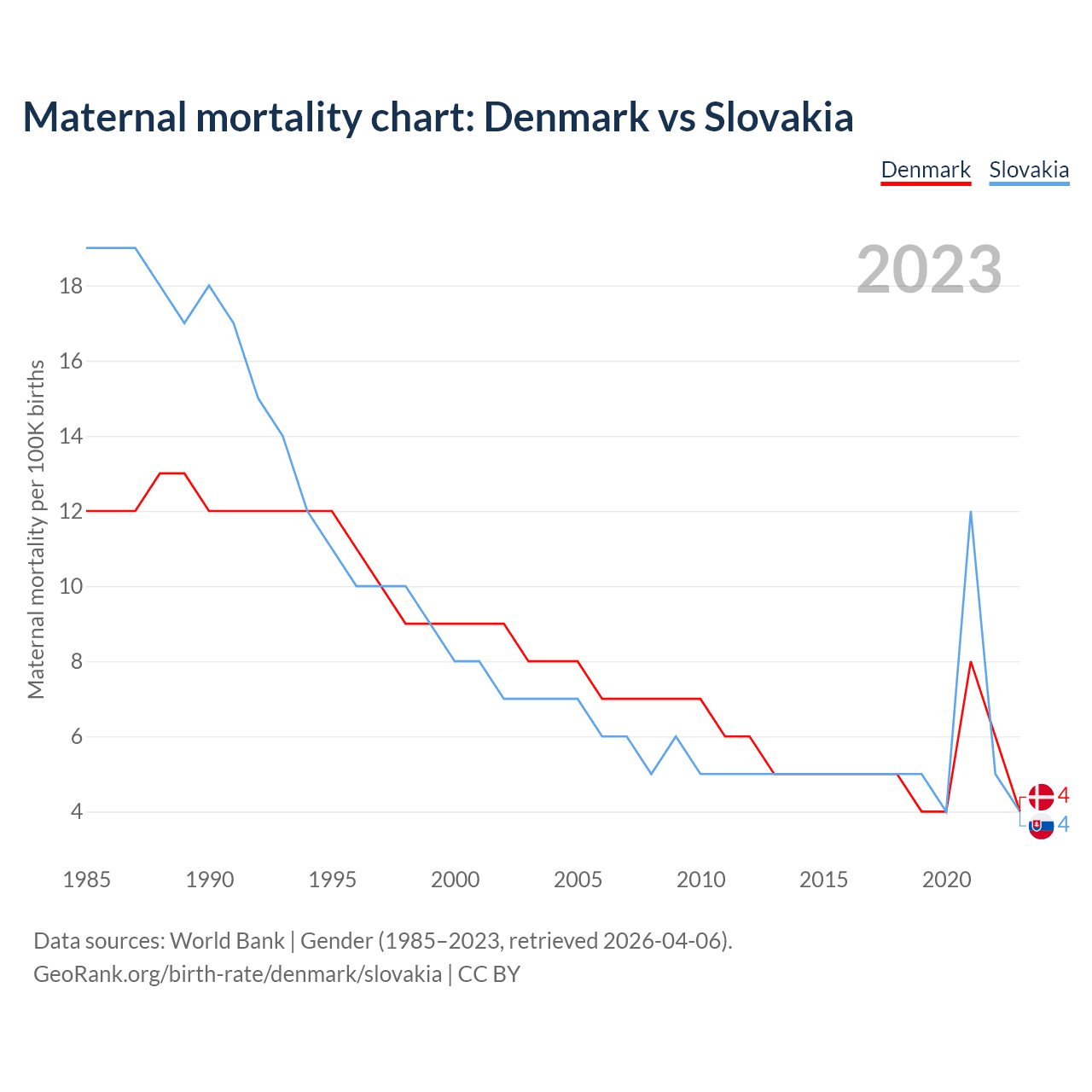 The maternal mortality rate, which is the probability of dying during childbirth or within 42 days of pregnancy termination, is 4 deaths per 100,000 live births in Denmark, compared to 4 deaths in Slovakia.