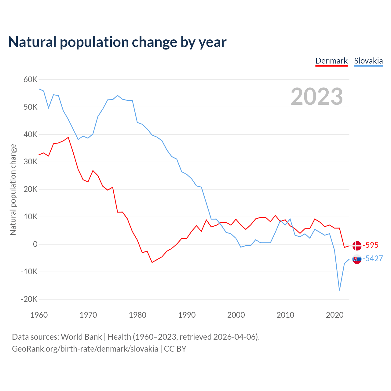 According to the latest available data on birth rates, the fertility rate in Denmark was 1.5 children per woman in 2023, compared to 1.49 in Slovakia in 2023. The replacement level is considered to be 2.1 children per woman.