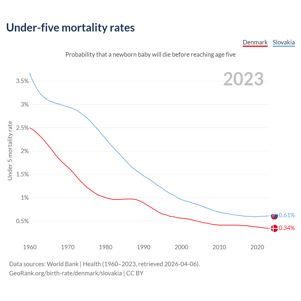 The chance that a newborn baby will die before reaching age five is 0.34% in Denmark and 0.61% in Slovakia. Above is a chart with historical data on under-five mortality rates.