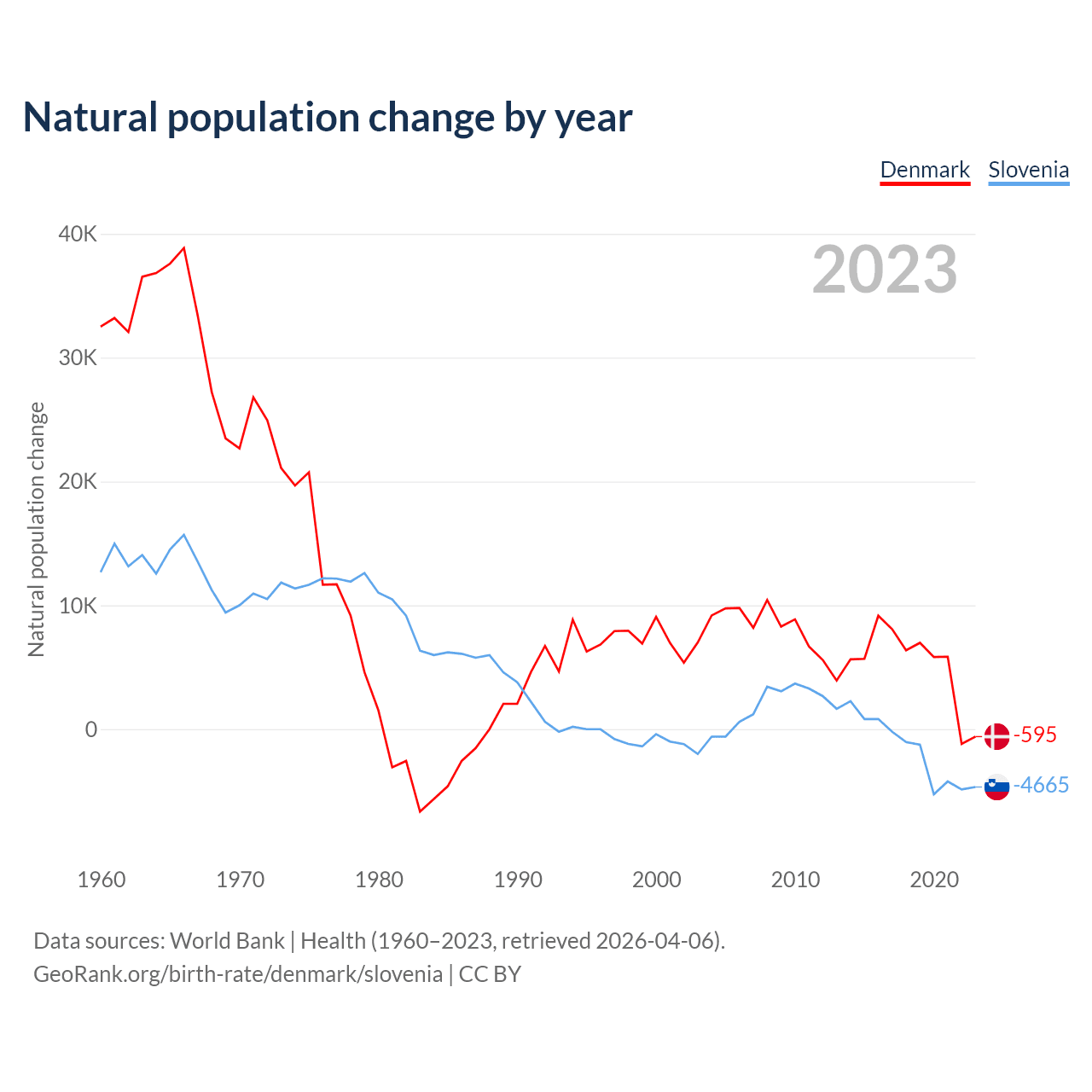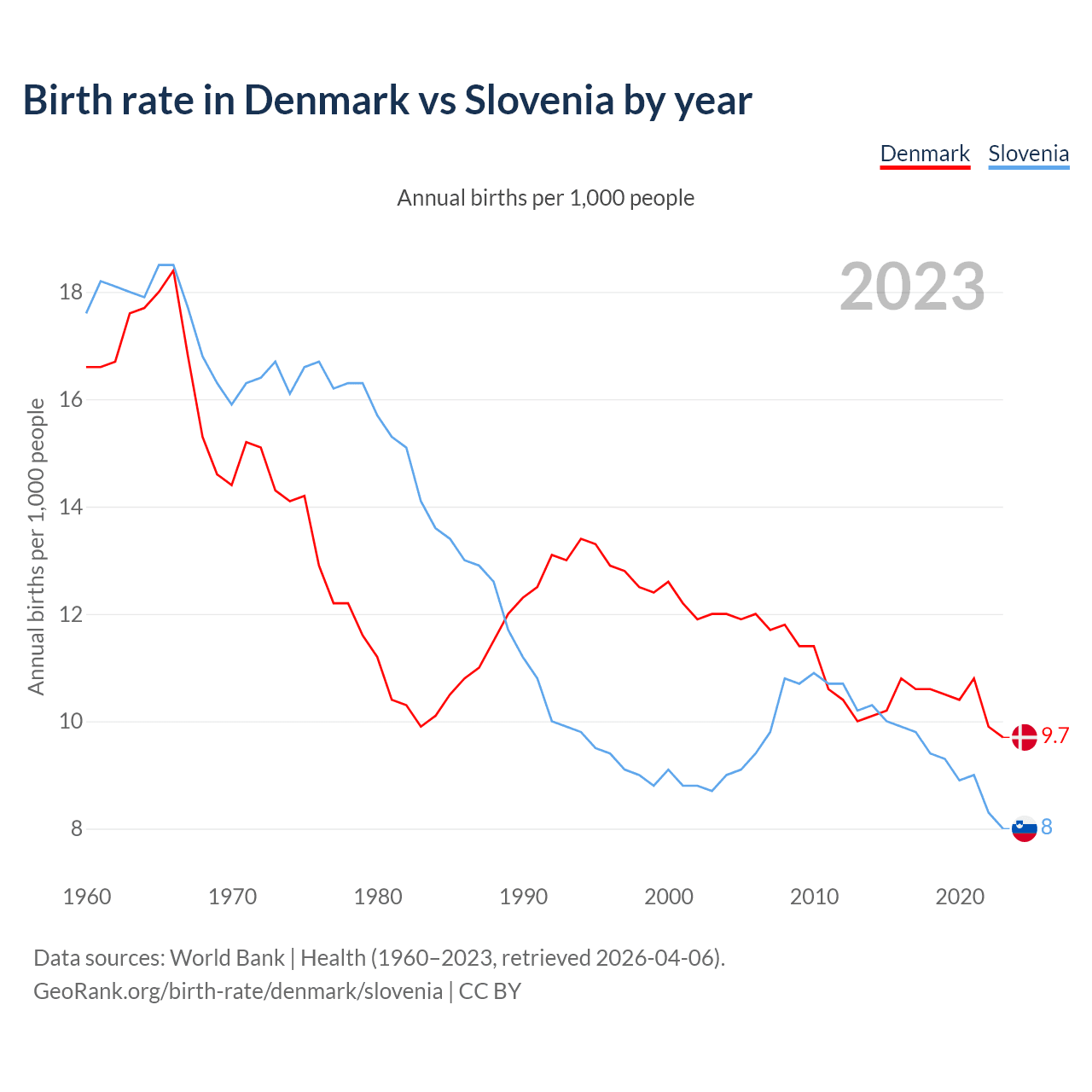 Denmark has an annual birth rate of 9.7 births per 1,000 people, compared to 8 for Slovenia. The average number of children a woman is expected to have during her lifetime — the fertility rate, is 1.5 in Denmark and 1.51 in Slovenia — 0.67% difference.