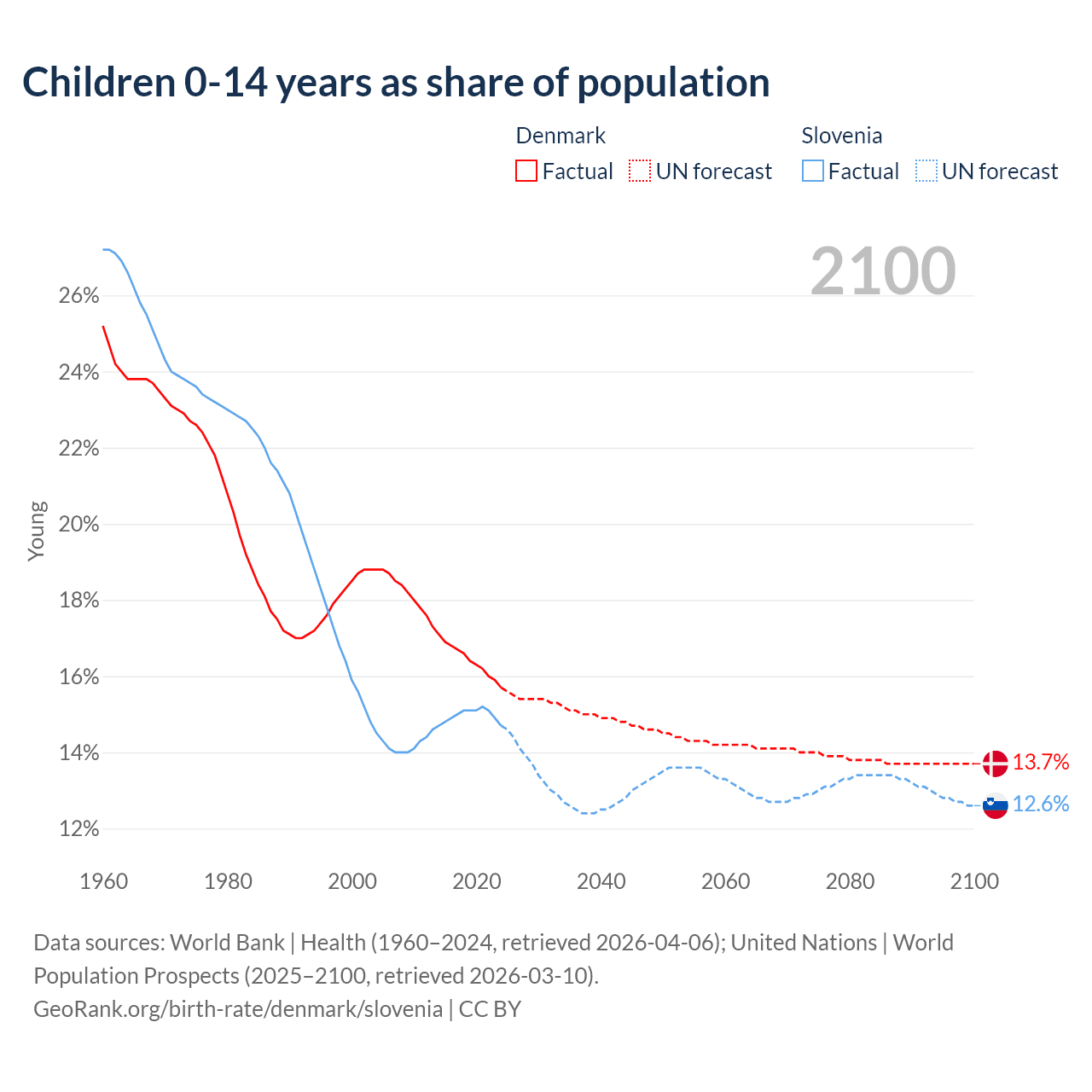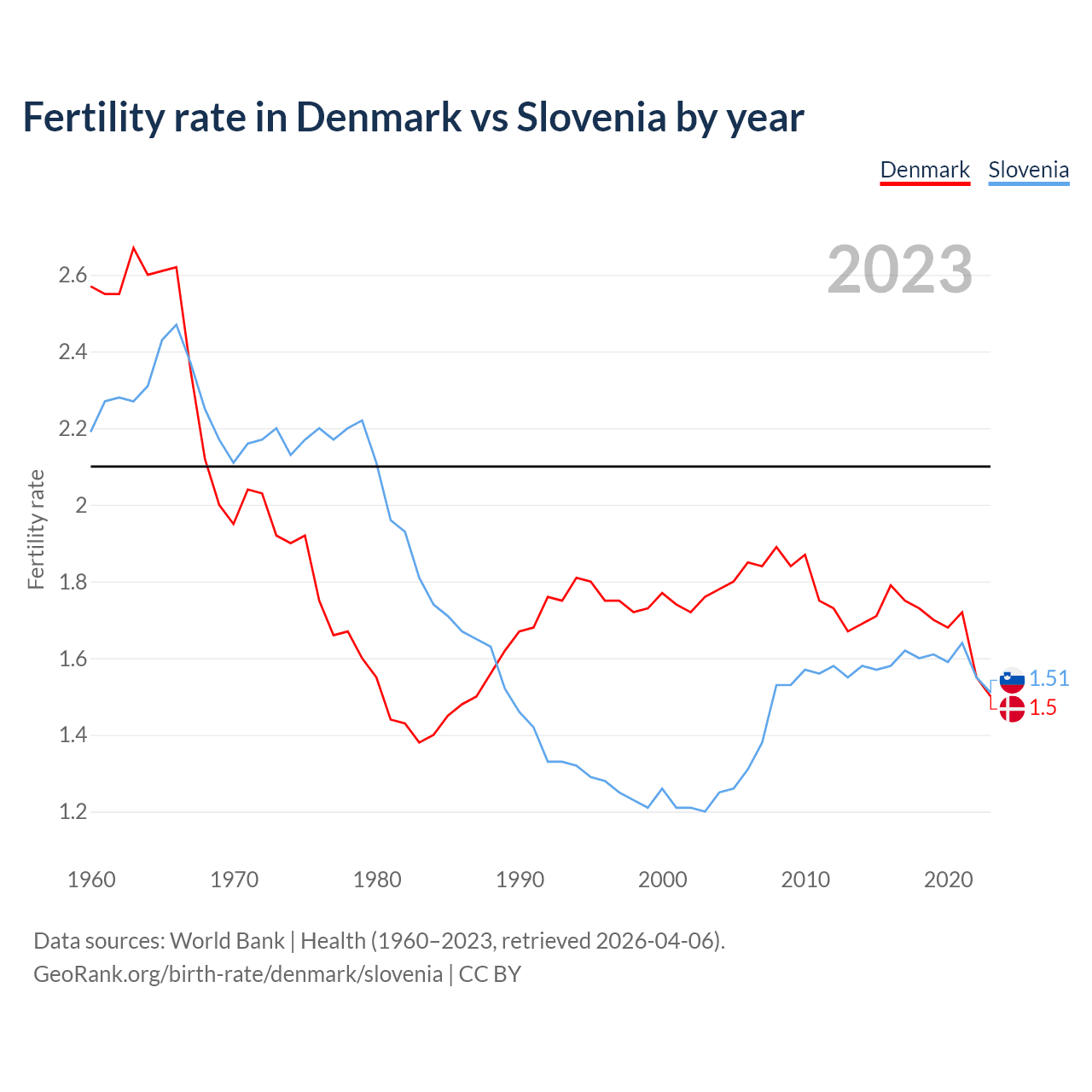 According to the latest available data on birth rates, the fertility rate in Denmark was 1.5 children per woman in 2023, compared to 1.51 in Slovenia in 2023. The replacement level is considered to be 2.1 children per woman.