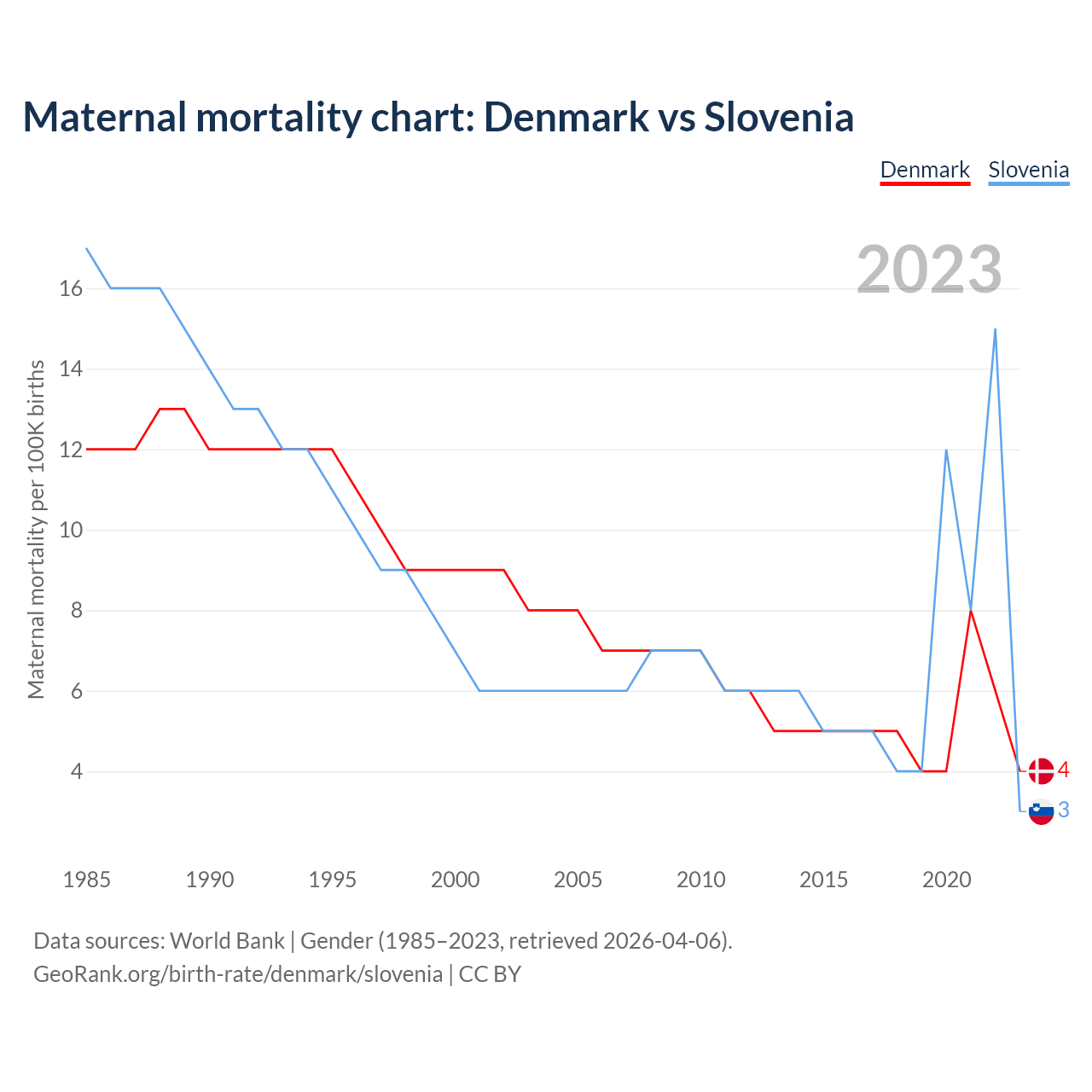 The maternal mortality rate, which is the probability of dying during childbirth or within 42 days of pregnancy termination, is 4 deaths per 100,000 live births in Denmark, compared to 3 deaths in Slovenia.