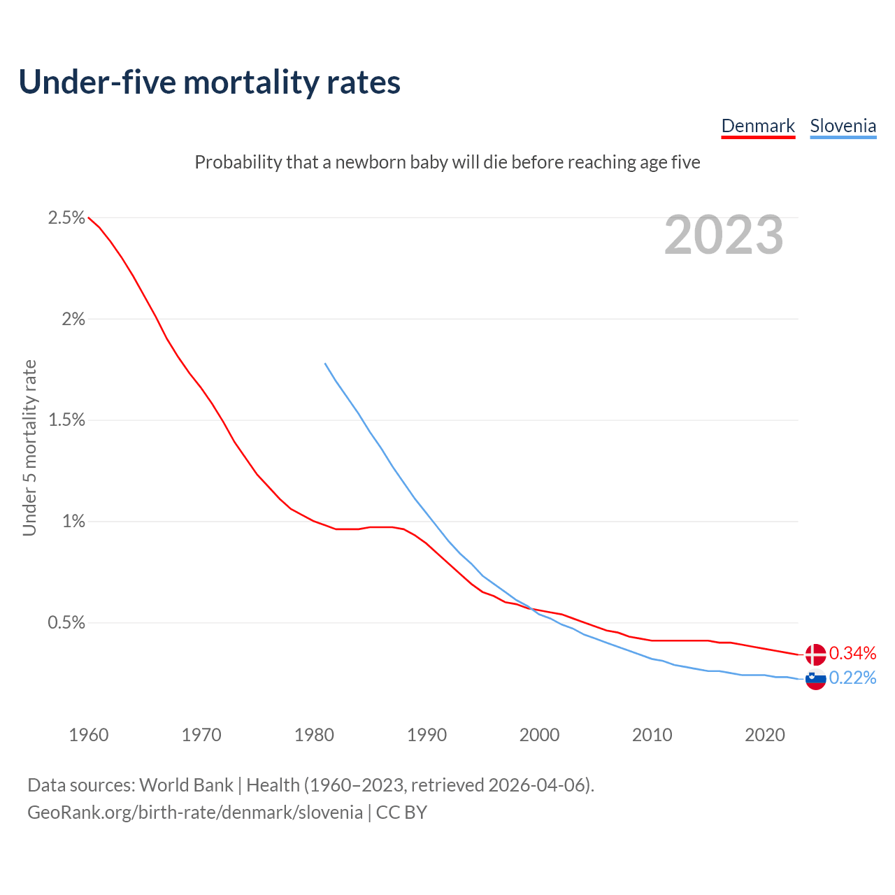 The chance that a newborn baby will die before reaching age five is 0.34% in Denmark and 0.22% in Slovenia. Above is a chart with historical data on under-five mortality rates.