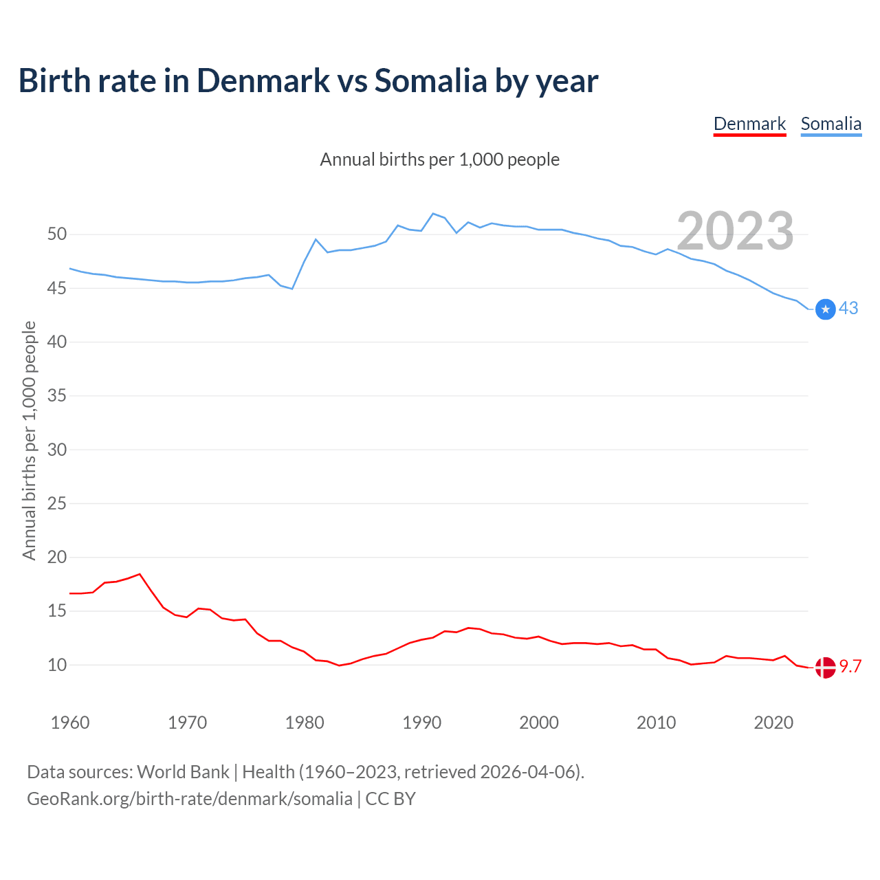 According to the latest available data on birth rates, the fertility rate in Denmark was 1.5 children per woman in 2023, compared to 6.13 in Somalia in 2023. The replacement level is considered to be 2.1 children per woman.