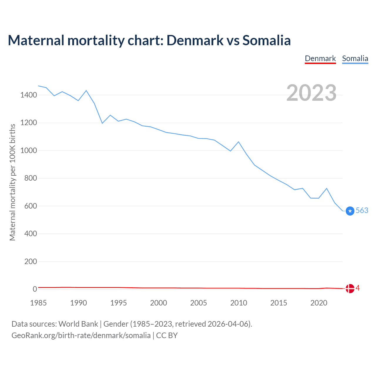 The maternal mortality rate, which is the probability of dying during childbirth or within 42 days of pregnancy termination, is 4 deaths per 100,000 live births in Denmark, compared to 563 deaths in Somalia.