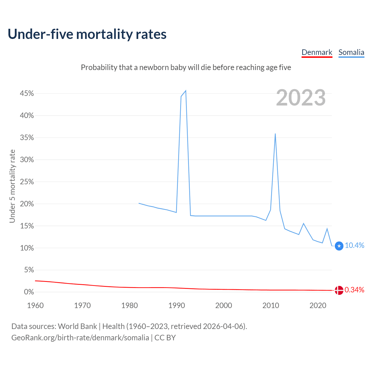 The chance that a newborn baby will die before reaching age five is 0.34% in Denmark and 10.4% in Somalia. Above is a chart with historical data on under-five mortality rates.