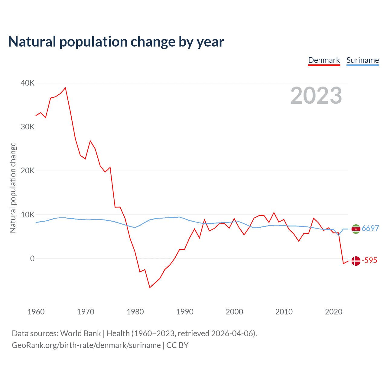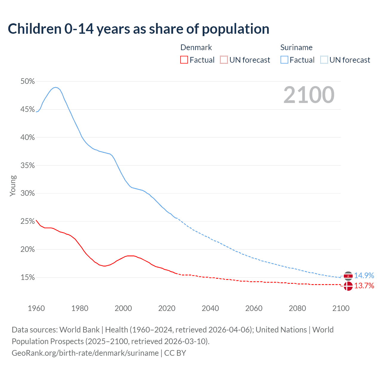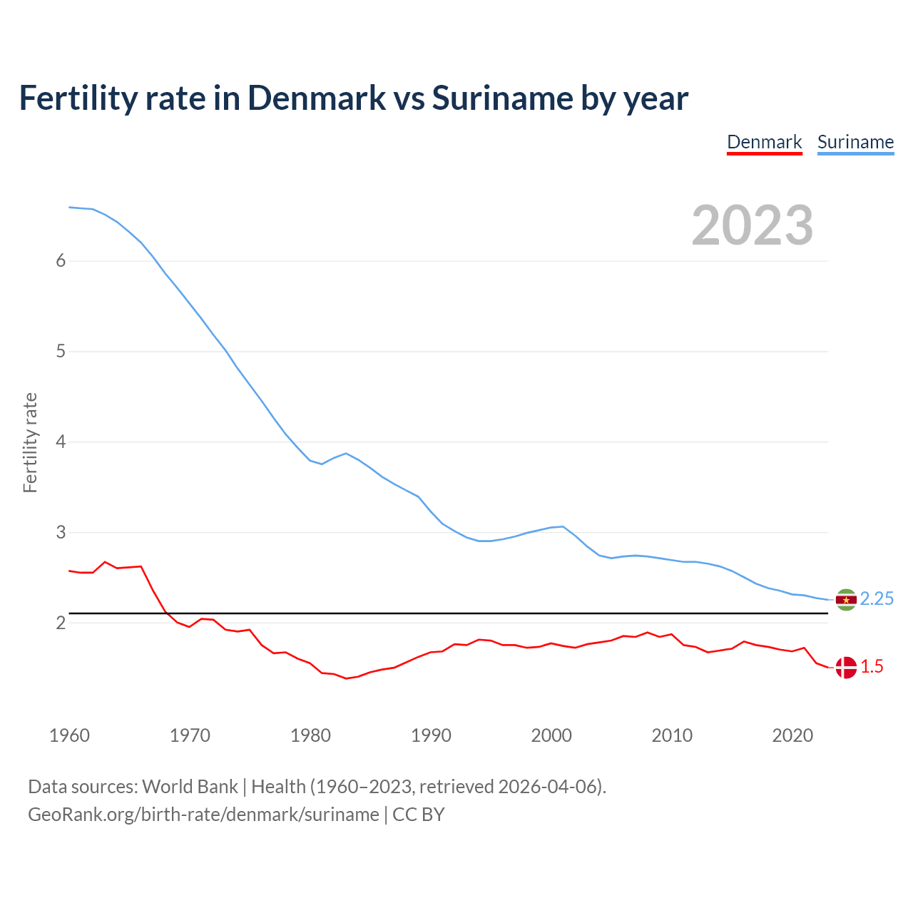 According to the latest available data on birth rates, the fertility rate in Denmark was 1.5 children per woman in 2023, compared to 2.25 in Suriname in 2023. The replacement level is considered to be 2.1 children per woman.