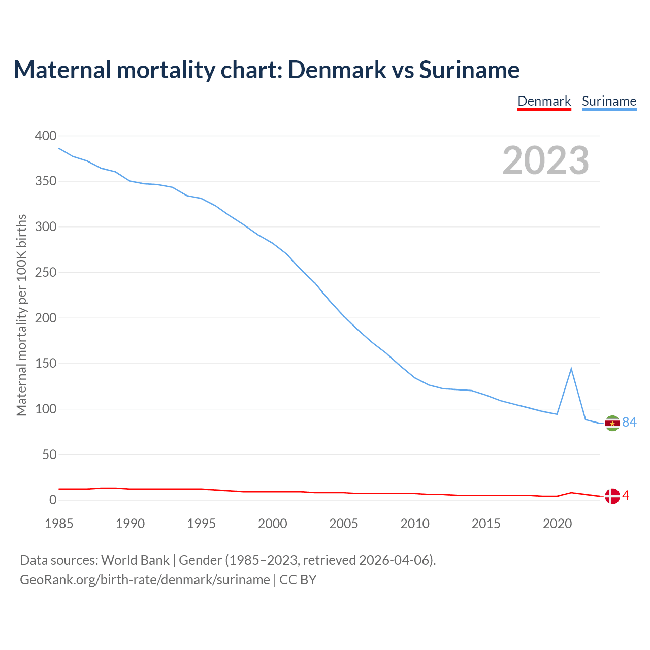 The maternal mortality rate, which is the probability of dying during childbirth or within 42 days of pregnancy termination, is 4 deaths per 100,000 live births in Denmark, compared to 84 deaths in Suriname.