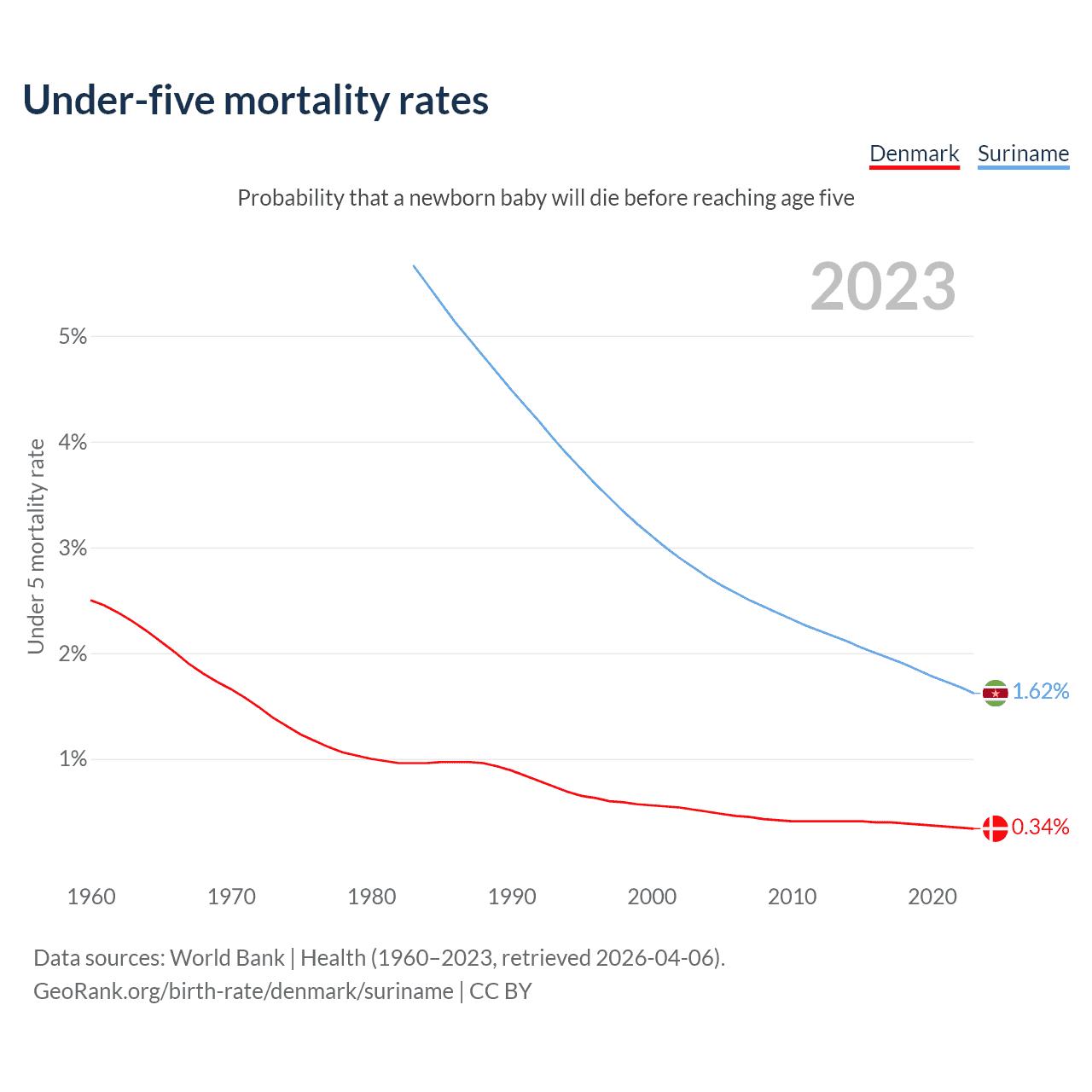 The chance that a newborn baby will die before reaching age five is 0.34% in Denmark and 1.62% in Suriname. Above is a chart with historical data on under-five mortality rates.