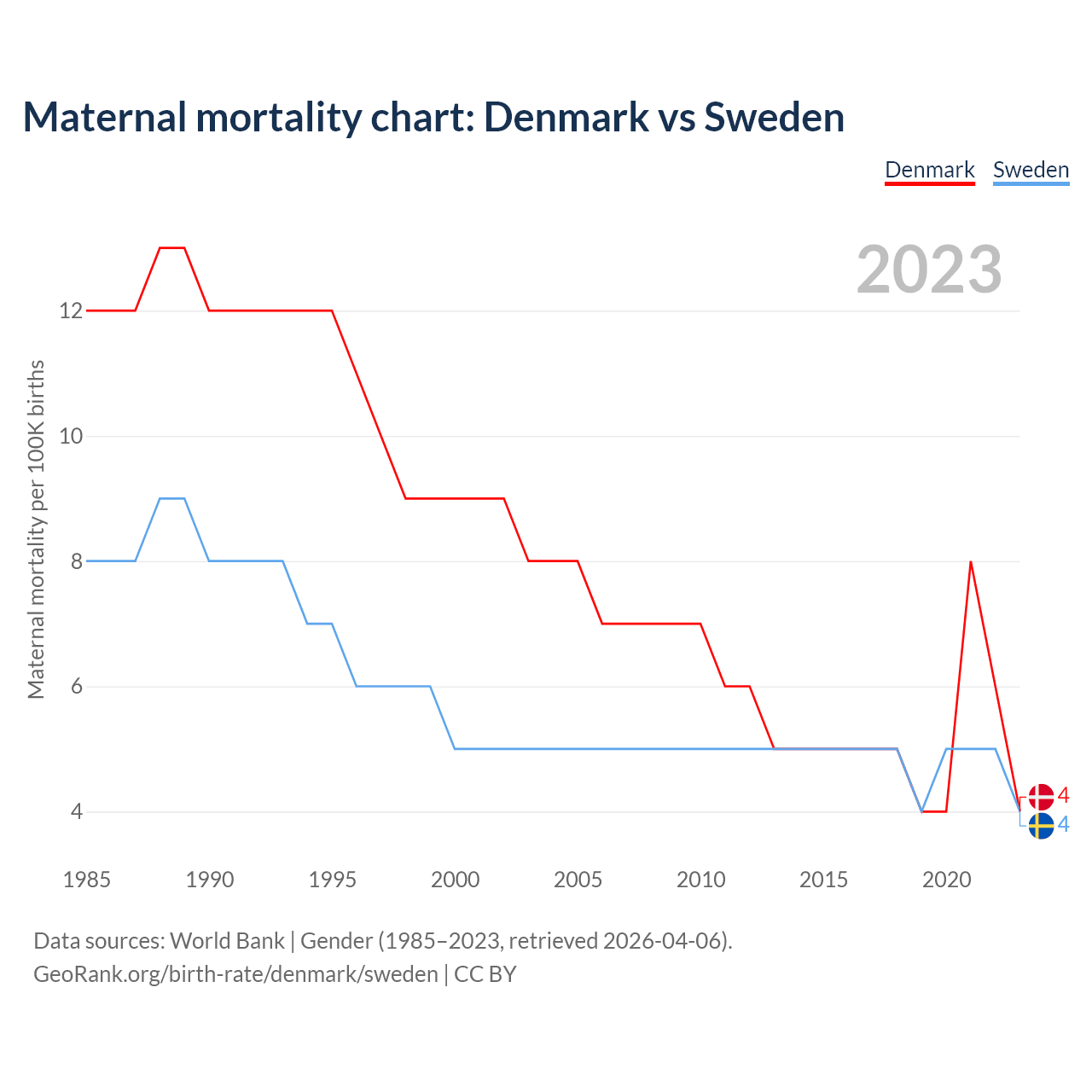 The maternal mortality rate, which is the probability of dying during childbirth or within 42 days of pregnancy termination, is 4 deaths per 100,000 live births in Denmark, compared to 4 deaths in Sweden.