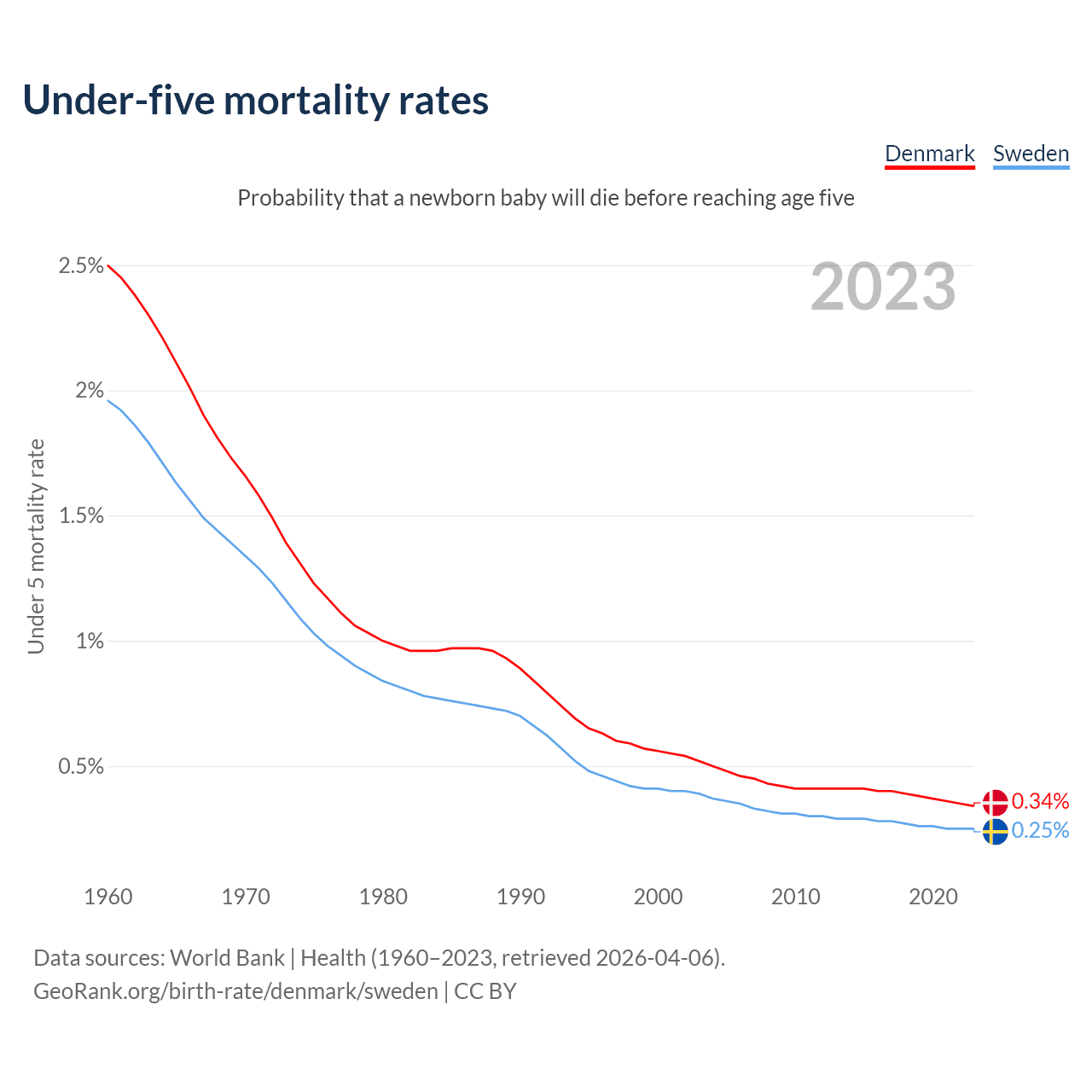 The chance that a newborn baby will die before reaching age five is 0.34% in Denmark and 0.25% in Sweden. Above is a chart with historical data on under-five mortality rates.