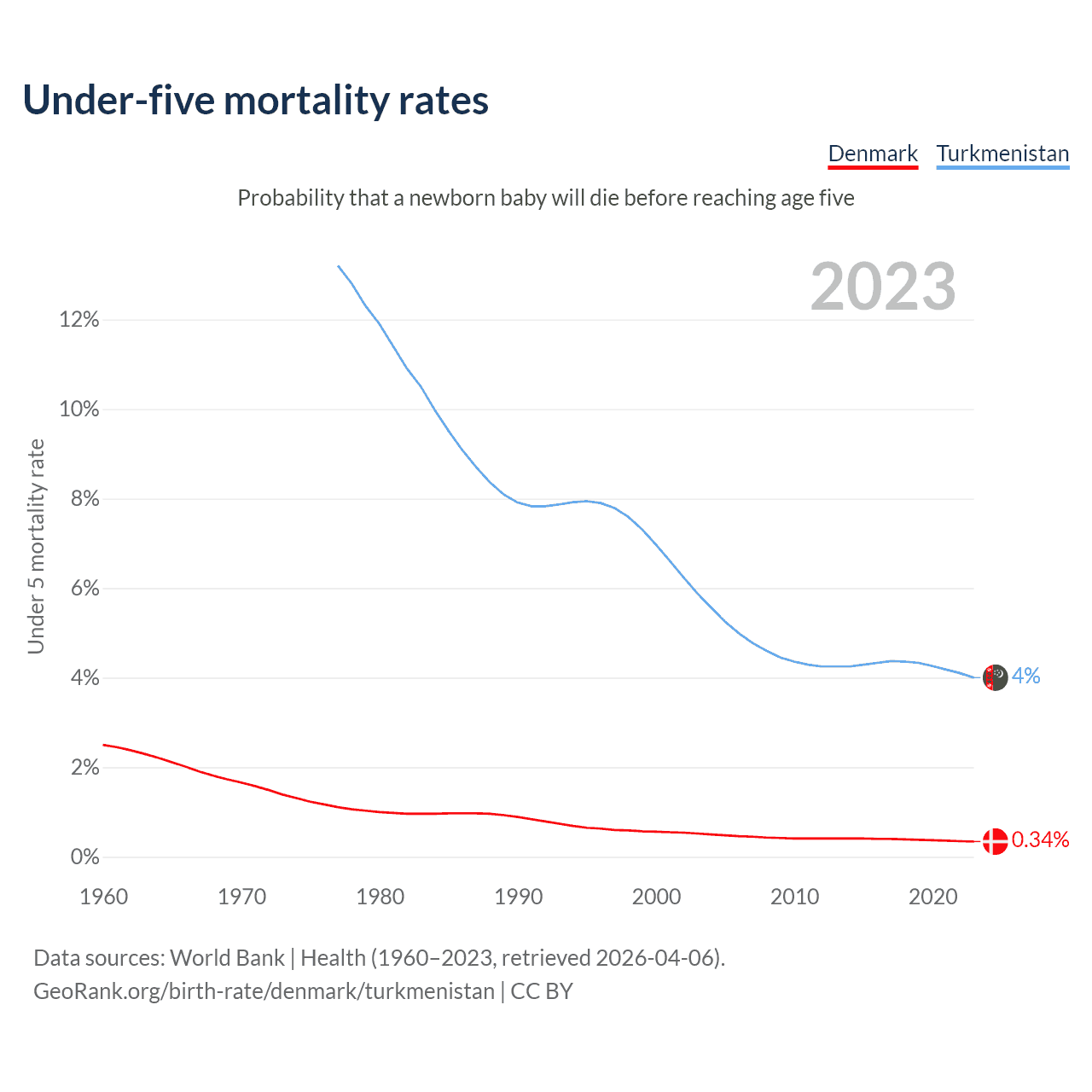 The chance that a newborn baby will die before reaching age five is 0.34% in Denmark and 4% in Turkmenistan. Above is a chart with historical data on under-five mortality rates.