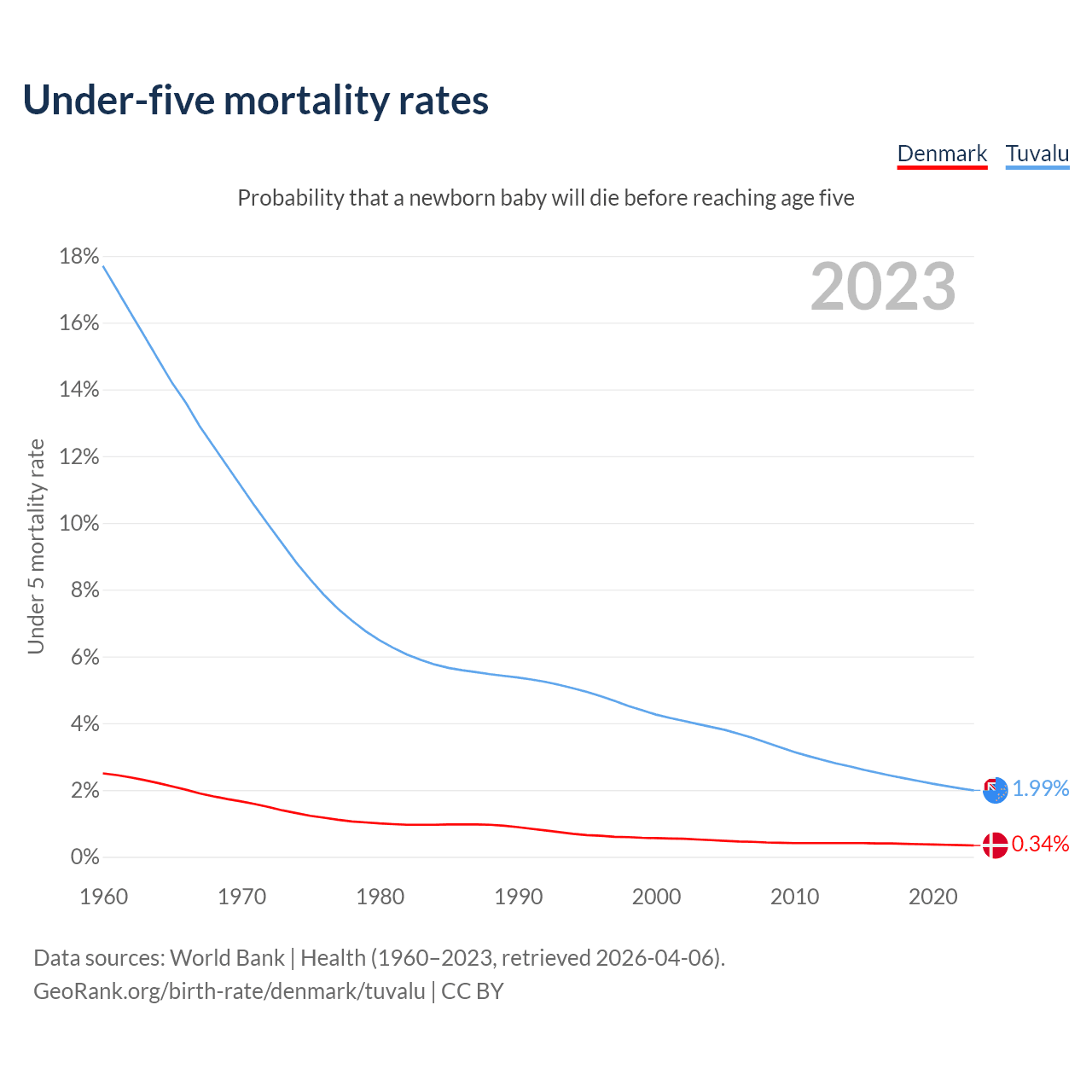 The chance that a newborn baby will die before reaching age five is 0.34% in Denmark and 1.99% in Tuvalu. Above is a chart with historical data on under-five mortality rates.
