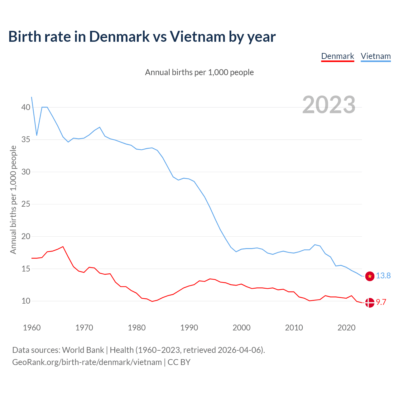 According to the latest available data on birth rates, the fertility rate in Denmark was 1.5 children per woman in 2023, compared to 1.91 in Vietnam in 2023. The replacement level is considered to be 2.1 children per woman.