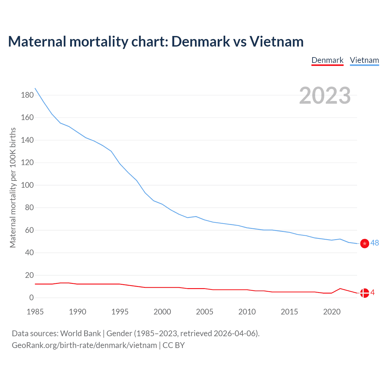 The maternal mortality rate, which is the probability of dying during childbirth or within 42 days of pregnancy termination, is 4 deaths per 100,000 live births in Denmark, compared to 48 deaths in Vietnam.