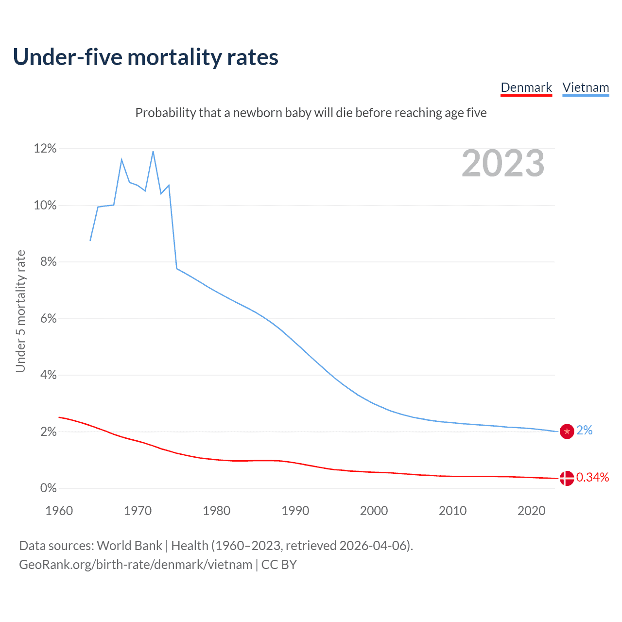 The chance that a newborn baby will die before reaching age five is 0.34% in Denmark and 2% in Vietnam. Above is a chart with historical data on under-five mortality rates.
