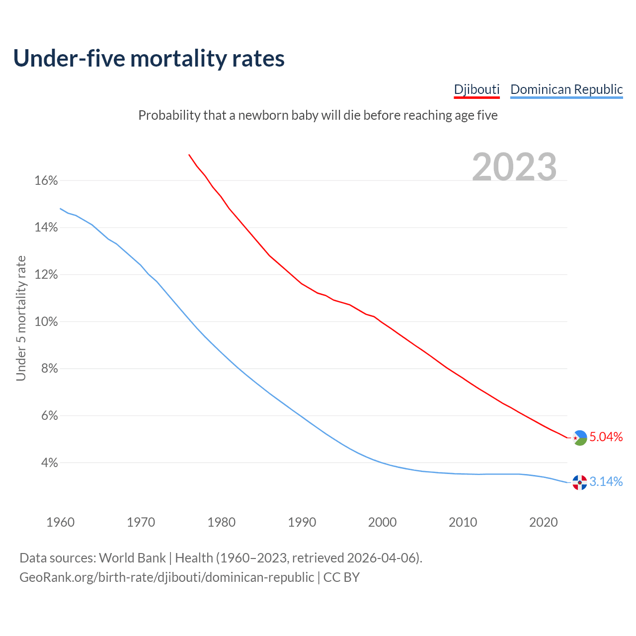 The chance that a newborn baby will die before reaching age five is 5.04% in Djibouti and 3.14% in the Dominican Republic. Above is a chart with historical data on under-five mortality rates.