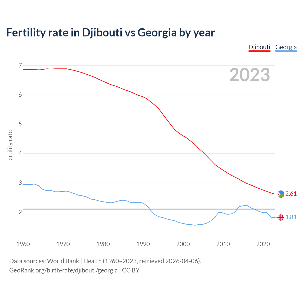 According to the latest available data on birth rates, the fertility rate in Djibouti was 2.61 children per woman in 2023, compared to 1.81 in Georgia in 2023. The replacement level is considered to be 2.1 children per woman.