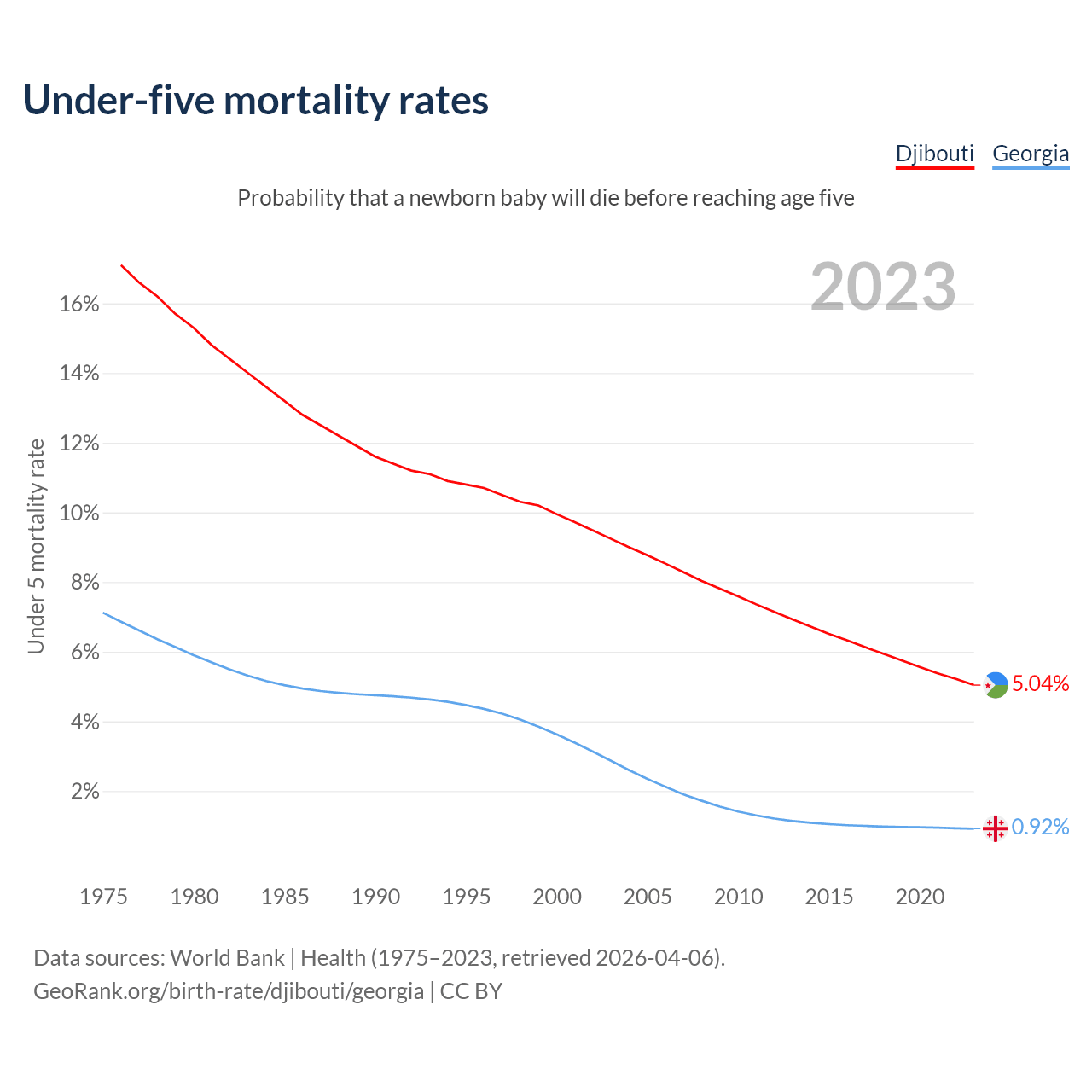 The chance that a newborn baby will die before reaching age five is 5.04% in Djibouti and 0.92% in Georgia. Above is a chart with historical data on under-five mortality rates.