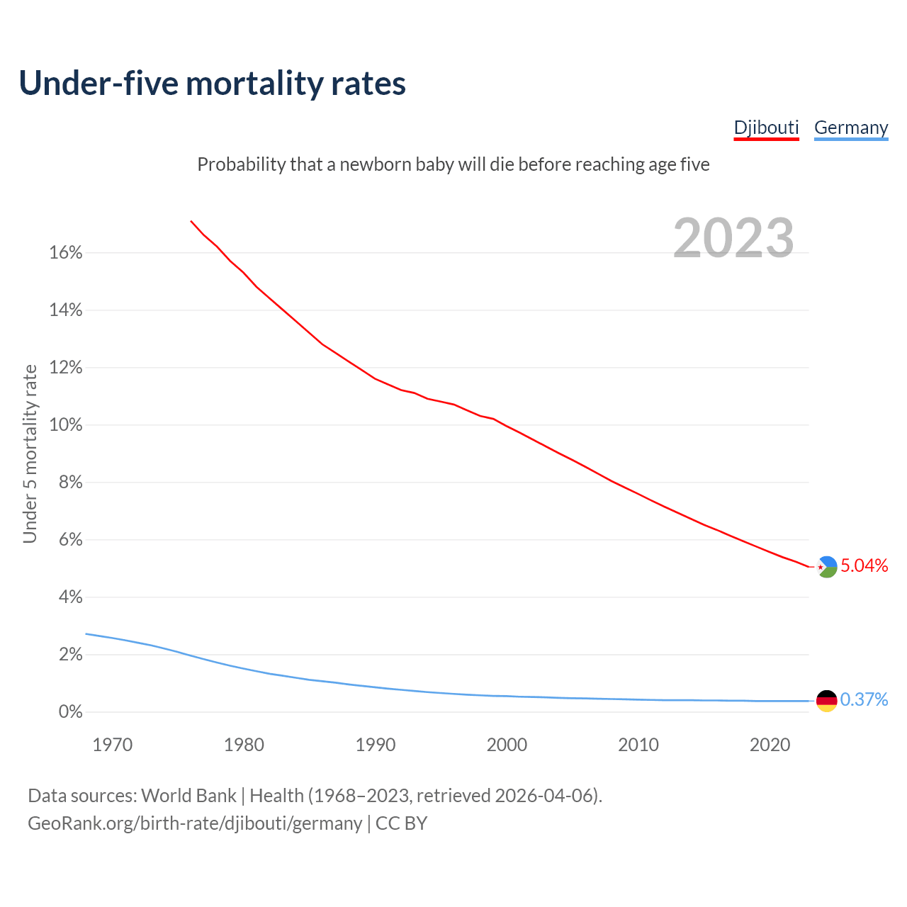 The chance that a newborn baby will die before reaching age five is 5.04% in Djibouti and 0.37% in Germany. Above is a chart with historical data on under-five mortality rates.