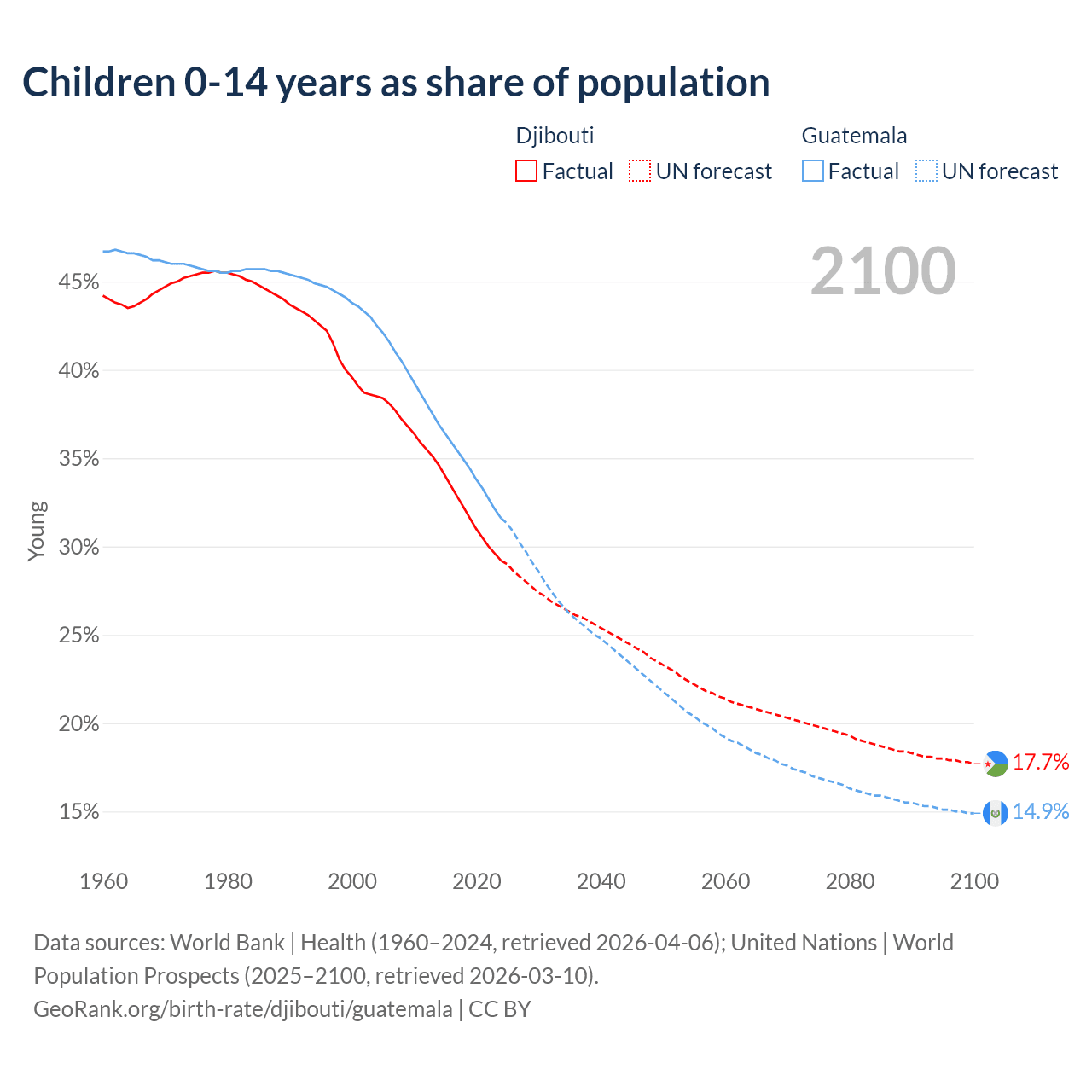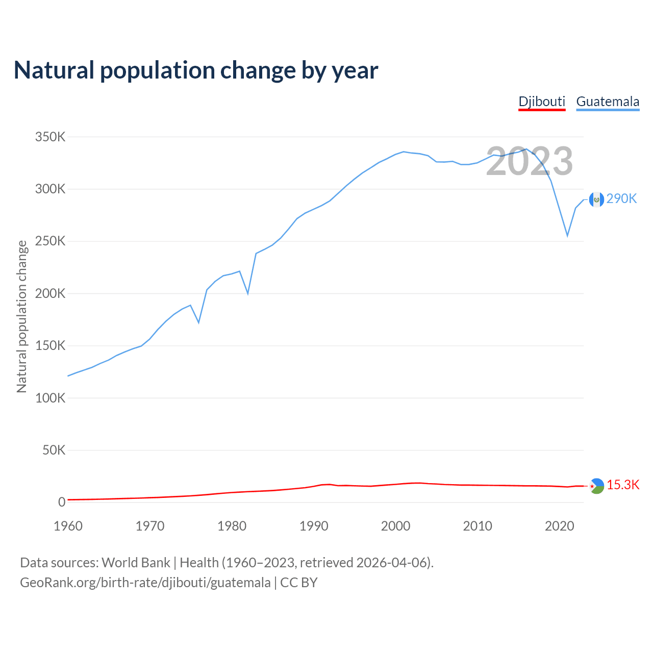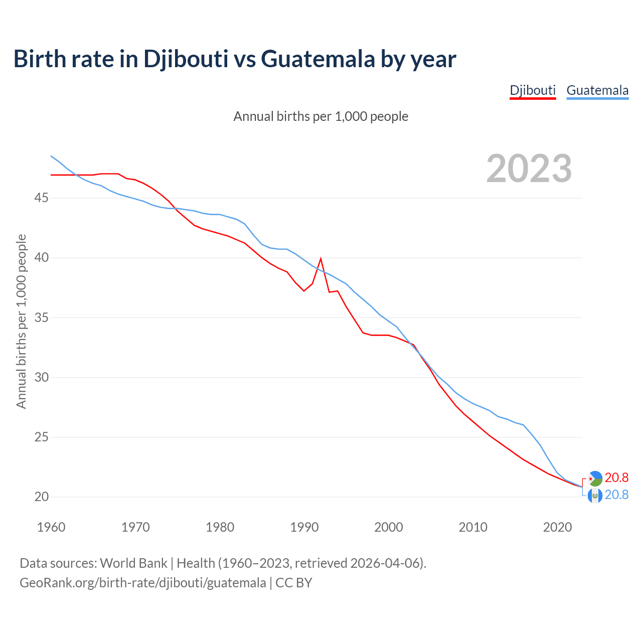 According to the latest available data on birth rates, the fertility rate in Djibouti was 2.61 children per woman in 2023, compared to 2.31 in Guatemala in 2023. The replacement level is considered to be 2.1 children per woman.