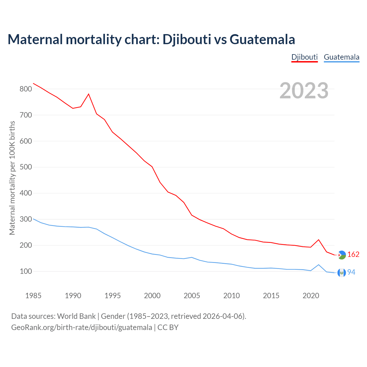 The maternal mortality rate, which is the probability of dying during childbirth or within 42 days of pregnancy termination, is 162 deaths per 100,000 live births in Djibouti, compared to 94 deaths in Guatemala.