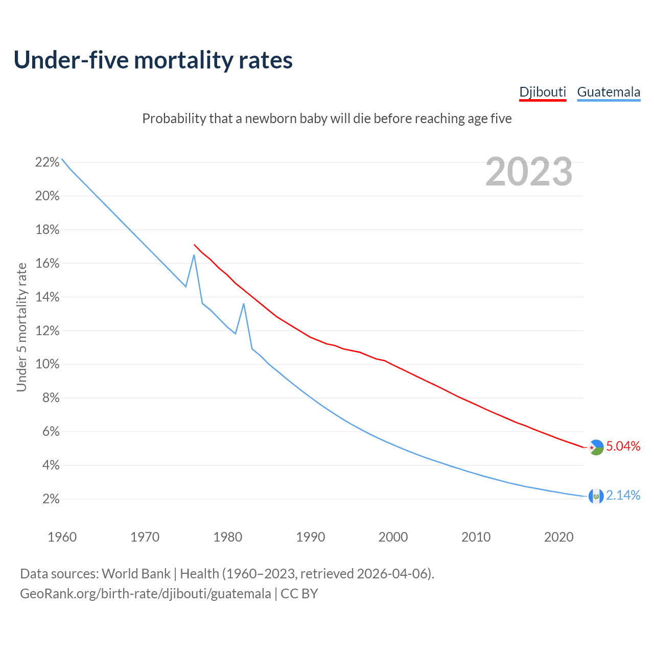 The chance that a newborn baby will die before reaching age five is 5.04% in Djibouti and 2.14% in Guatemala. Above is a chart with historical data on under-five mortality rates.