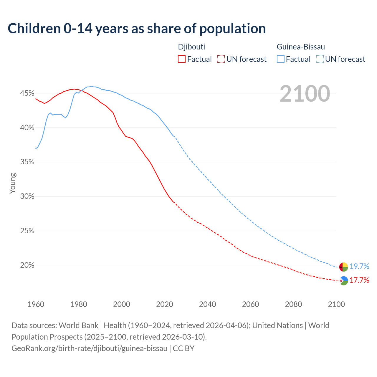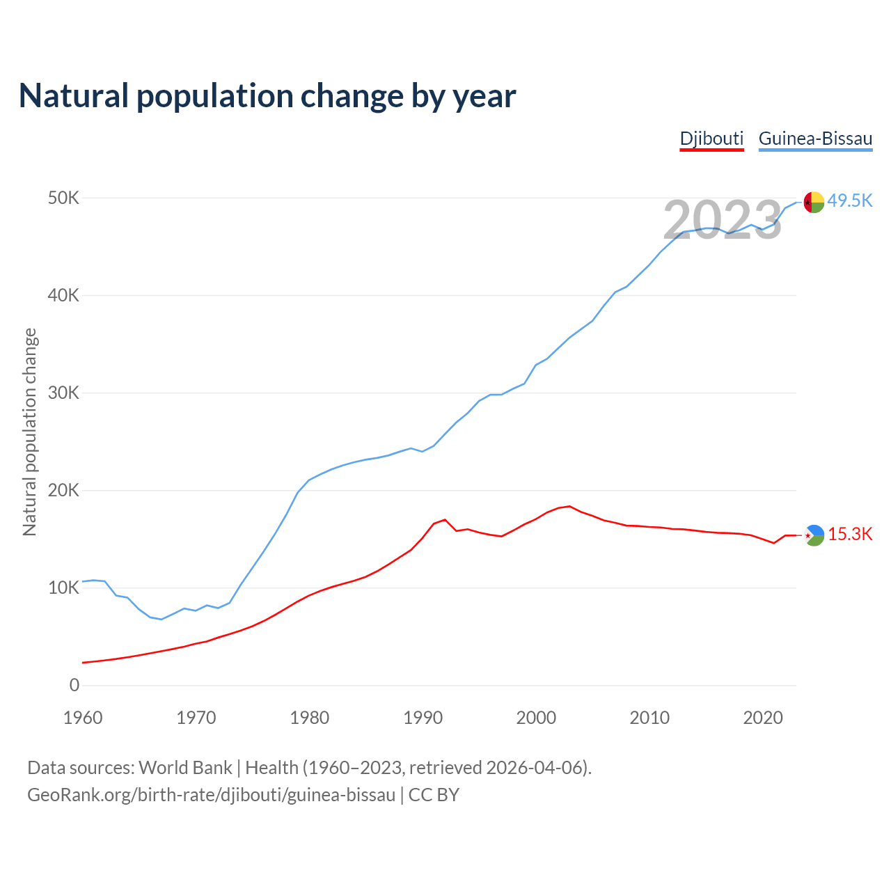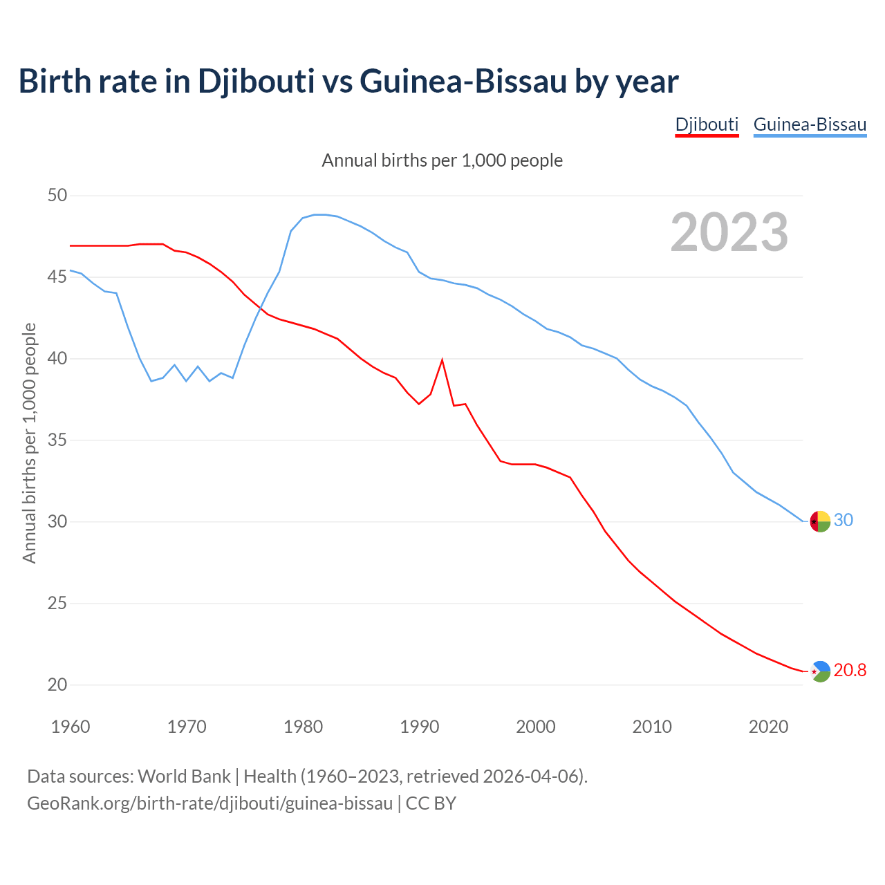 Djibouti has an annual birth rate of 20.8 births per 1,000 people, compared to 30 for Guinea-Bissau. The average number of children a woman is expected to have during her lifetime — the fertility rate, is 2.61 in Djibouti and 3.84 in Guinea-Bissau — 47% difference.