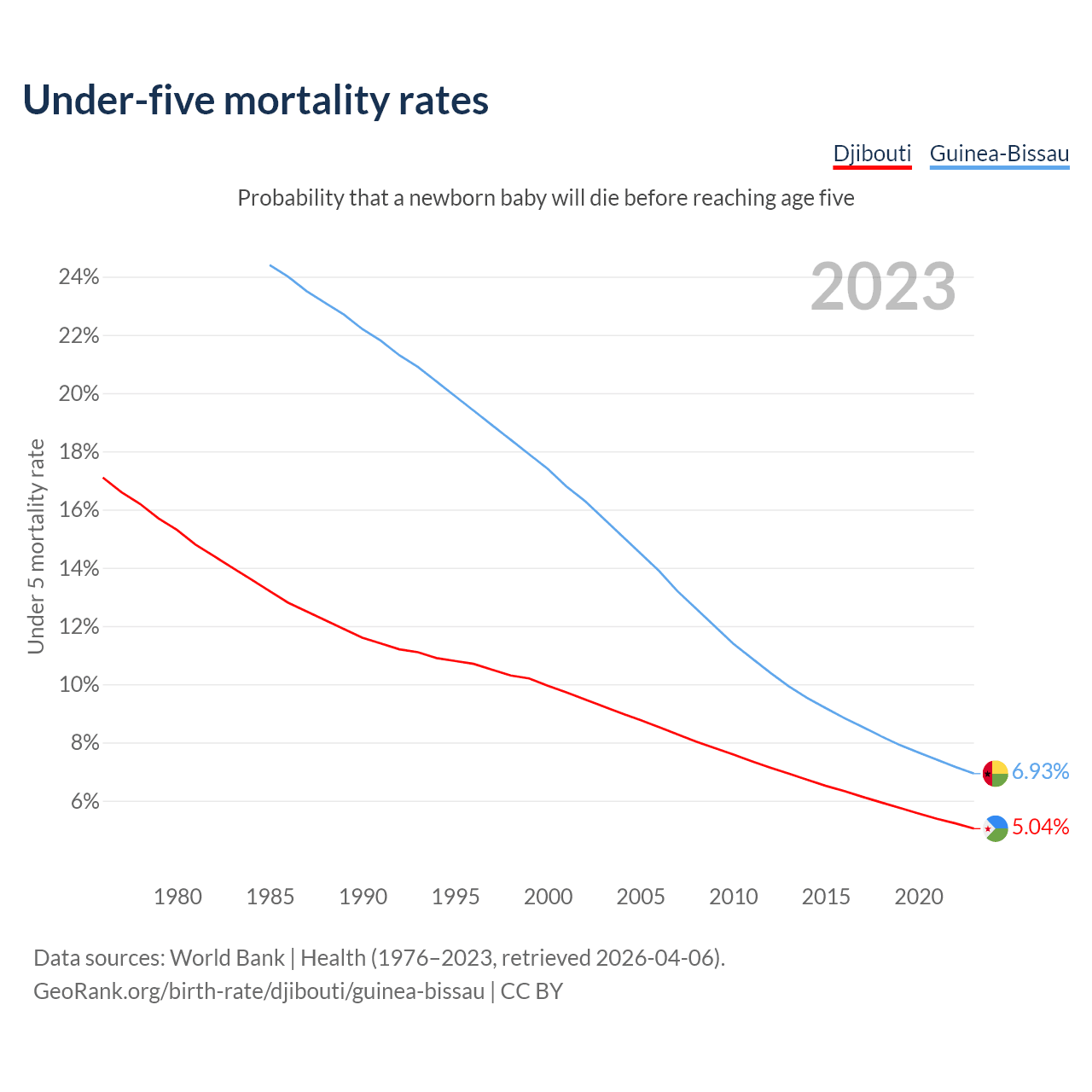 The chance that a newborn baby will die before reaching age five is 5.04% in Djibouti and 6.93% in Guinea-Bissau. Above is a chart with historical data on under-five mortality rates.