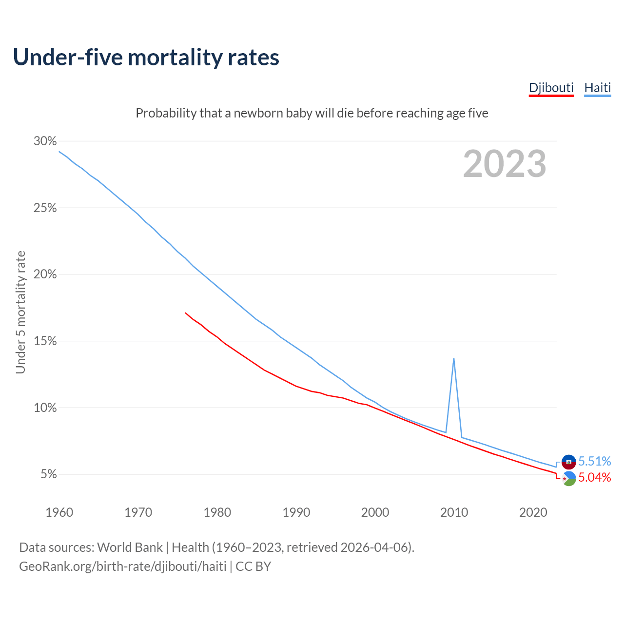 The chance that a newborn baby will die before reaching age five is 5.04% in Djibouti and 5.51% in Haiti. Above is a chart with historical data on under-five mortality rates.