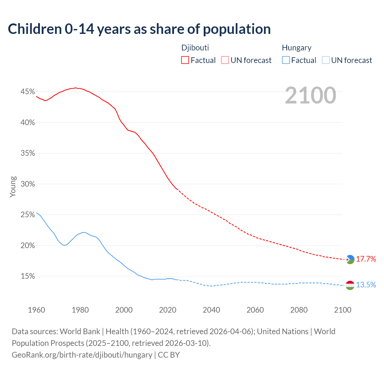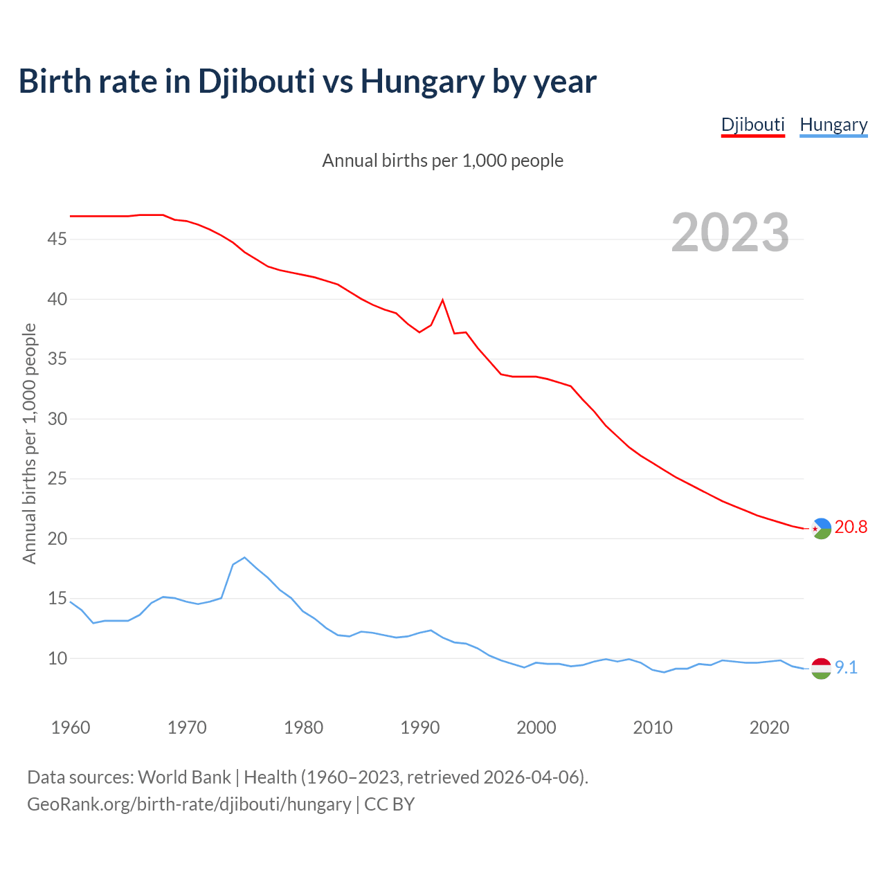 Djibouti has an annual birth rate of 20.8 births per 1,000 people, compared to 9.1 for Hungary. The average number of children a woman is expected to have during her lifetime — the fertility rate, is 2.61 in Djibouti and 1.51 in Hungary — 42.1% difference.