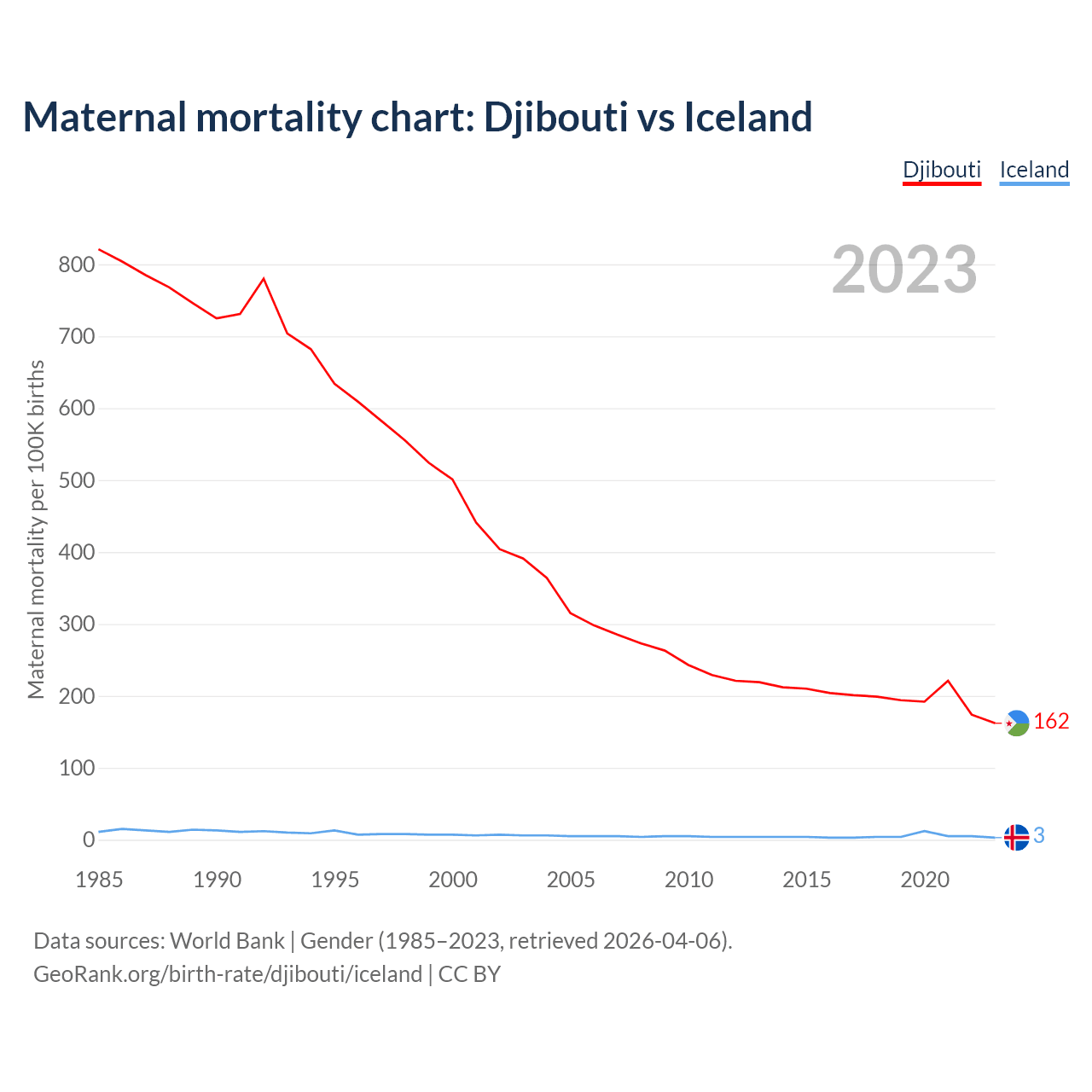 The maternal mortality rate, which is the probability of dying during childbirth or within 42 days of pregnancy termination, is 162 deaths per 100,000 live births in Djibouti, compared to 3 deaths in Iceland.