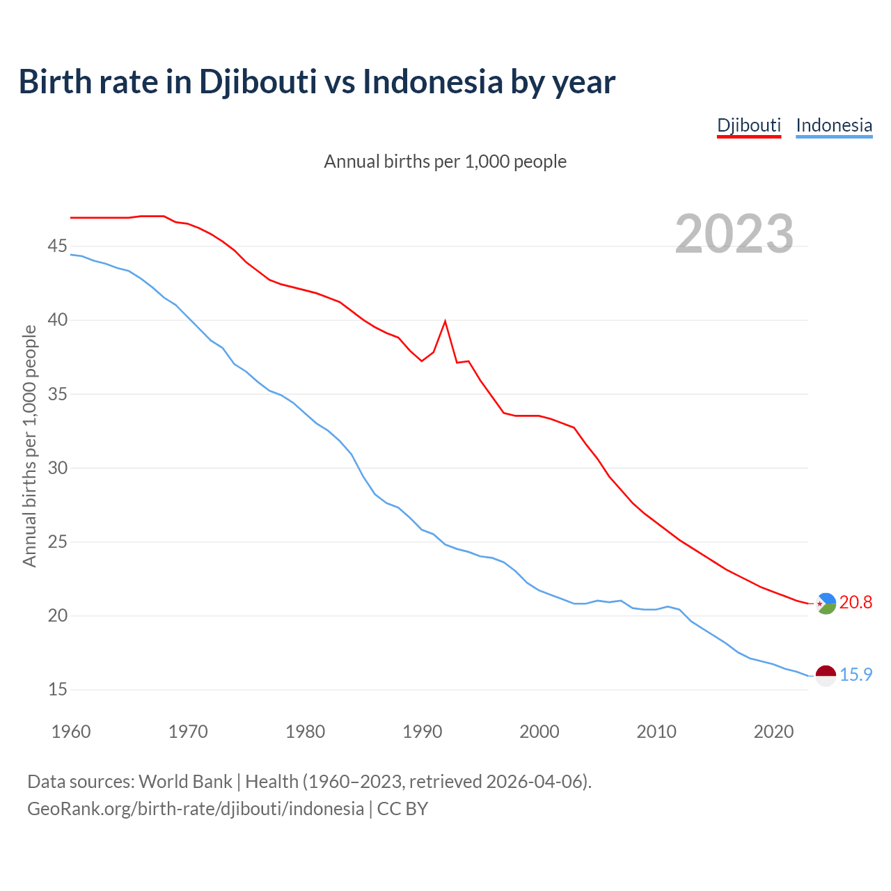 Djibouti has an annual birth rate of 20.8 births per 1,000 people, compared to 15.9 for Indonesia. The average number of children a woman is expected to have during her lifetime — the fertility rate, is 2.61 in Djibouti and 2.13 in Indonesia — 18.5% difference.