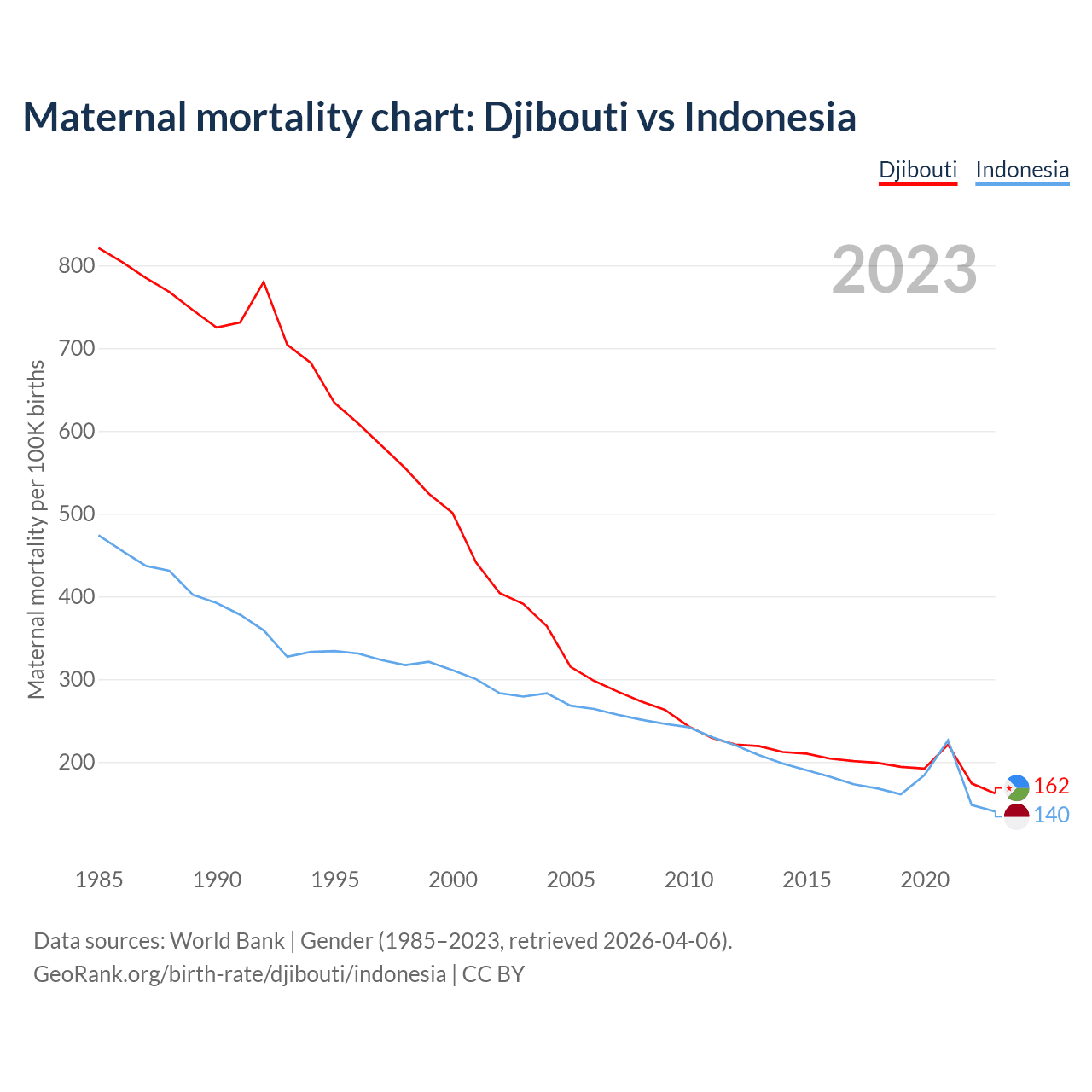 The maternal mortality rate, which is the probability of dying during childbirth or within 42 days of pregnancy termination, is 162 deaths per 100,000 live births in Djibouti, compared to 140 deaths in Indonesia.