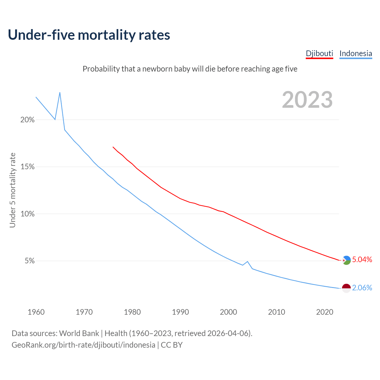 The chance that a newborn baby will die before reaching age five is 5.04% in Djibouti and 2.06% in Indonesia. Above is a chart with historical data on under-five mortality rates.