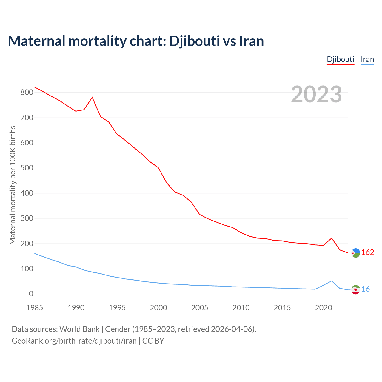 The maternal mortality rate, which is the probability of dying during childbirth or within 42 days of pregnancy termination, is 162 deaths per 100,000 live births in Djibouti, compared to 16 deaths in Iran.
