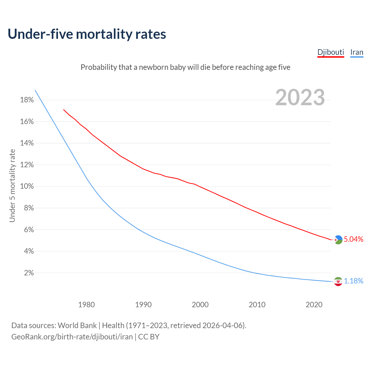 The chance that a newborn baby will die before reaching age five is 5.04% in Djibouti and 1.18% in Iran. Above is a chart with historical data on under-five mortality rates.