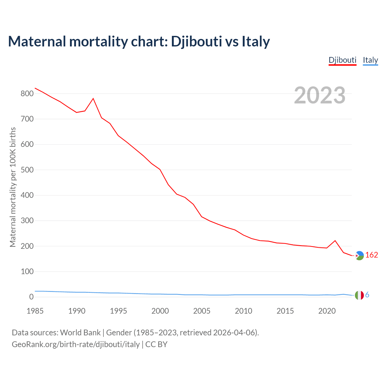 The maternal mortality rate, which is the probability of dying during childbirth or within 42 days of pregnancy termination, is 162 deaths per 100,000 live births in Djibouti, compared to 6 deaths in Italy.
