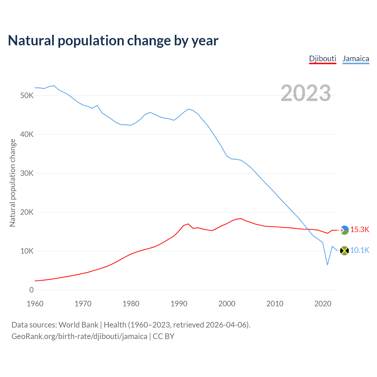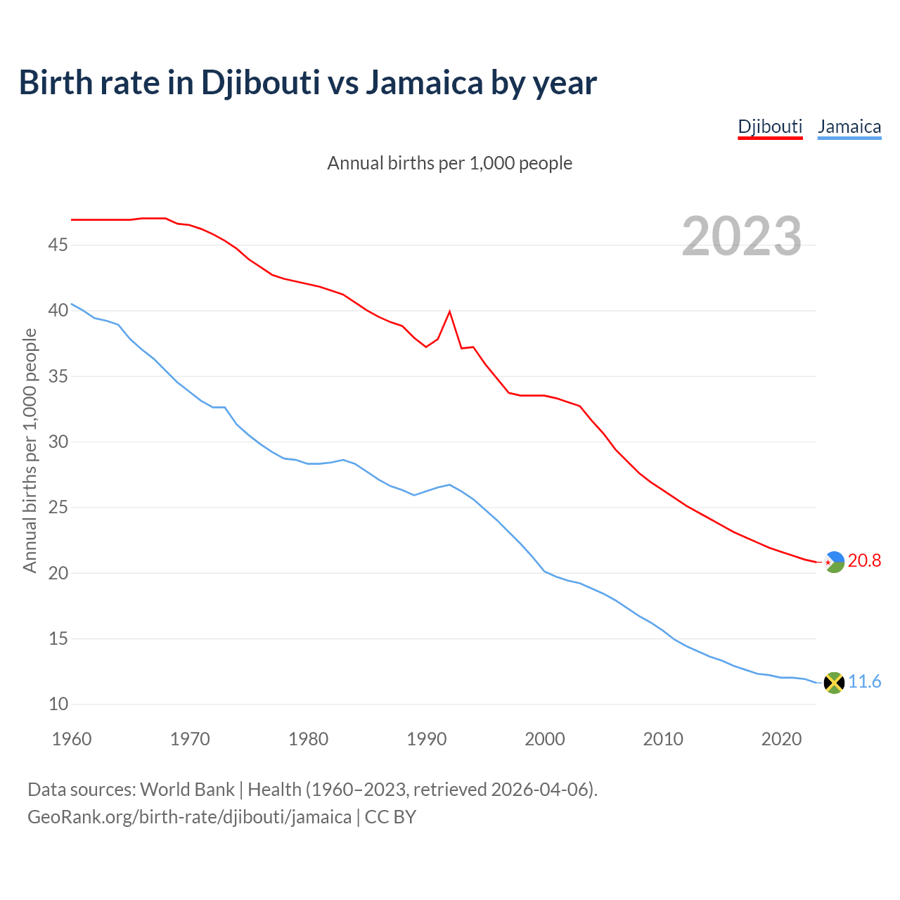 Djibouti has an annual birth rate of 20.8 births per 1,000 people, compared to 11.6 for Jamaica. The average number of children a woman is expected to have during her lifetime — the fertility rate, is 2.61 in Djibouti and 1.36 in Jamaica — 47.9% difference.