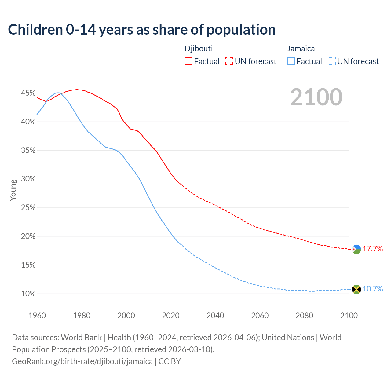 According to the latest available data on birth rates, the fertility rate in Djibouti was 2.61 children per woman in 2023, compared to 1.36 in Jamaica in 2023. The replacement level is considered to be 2.1 children per woman.