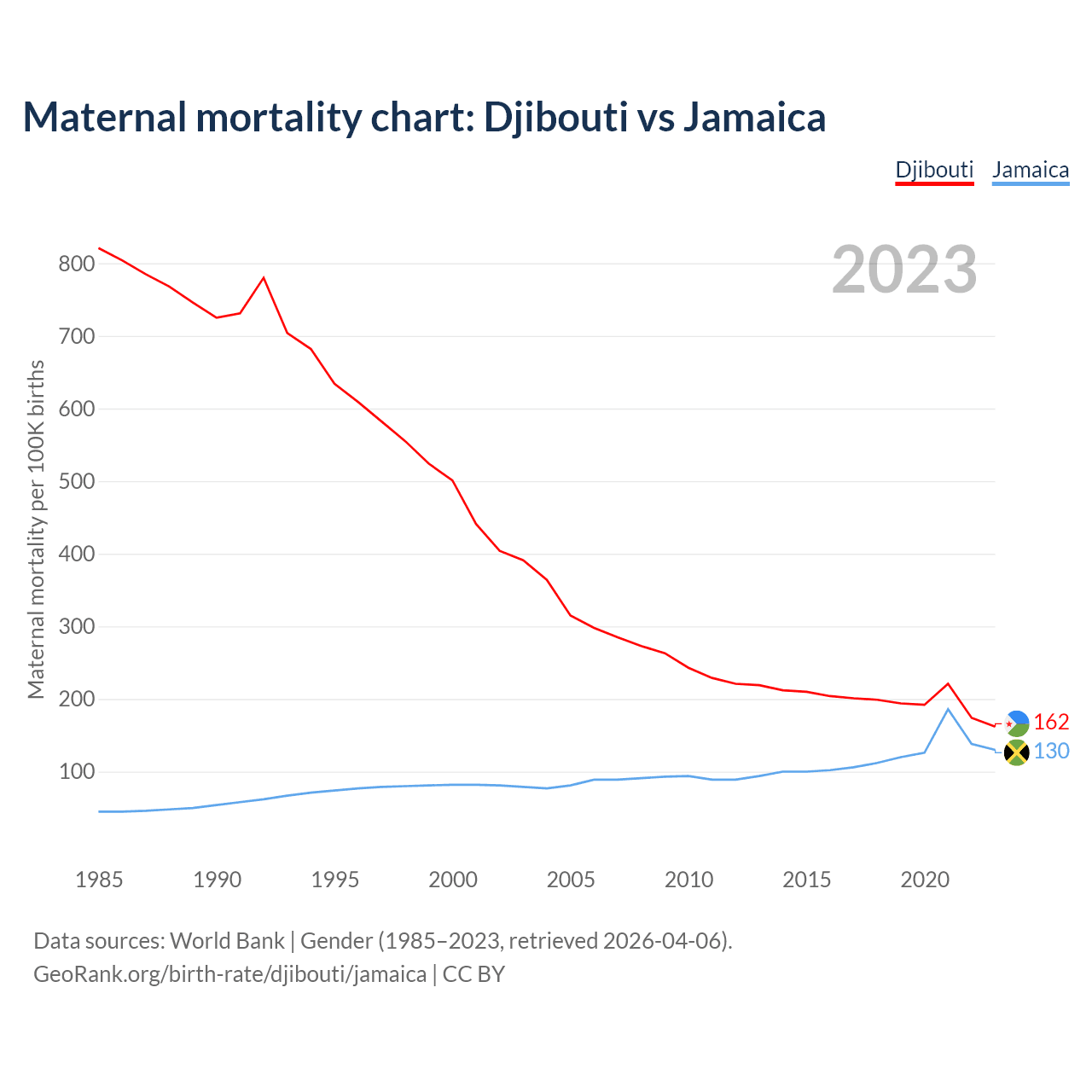 The maternal mortality rate, which is the probability of dying during childbirth or within 42 days of pregnancy termination, is 162 deaths per 100,000 live births in Djibouti, compared to 130 deaths in Jamaica.