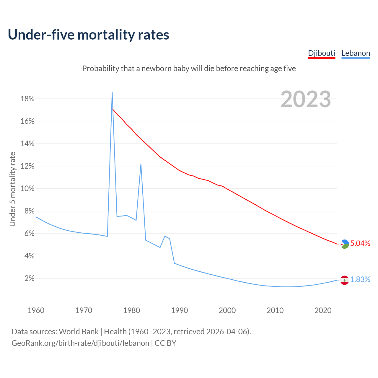 The chance that a newborn baby will die before reaching age five is 5.04% in Djibouti and 1.83% in Lebanon. Above is a chart with historical data on under-five mortality rates.