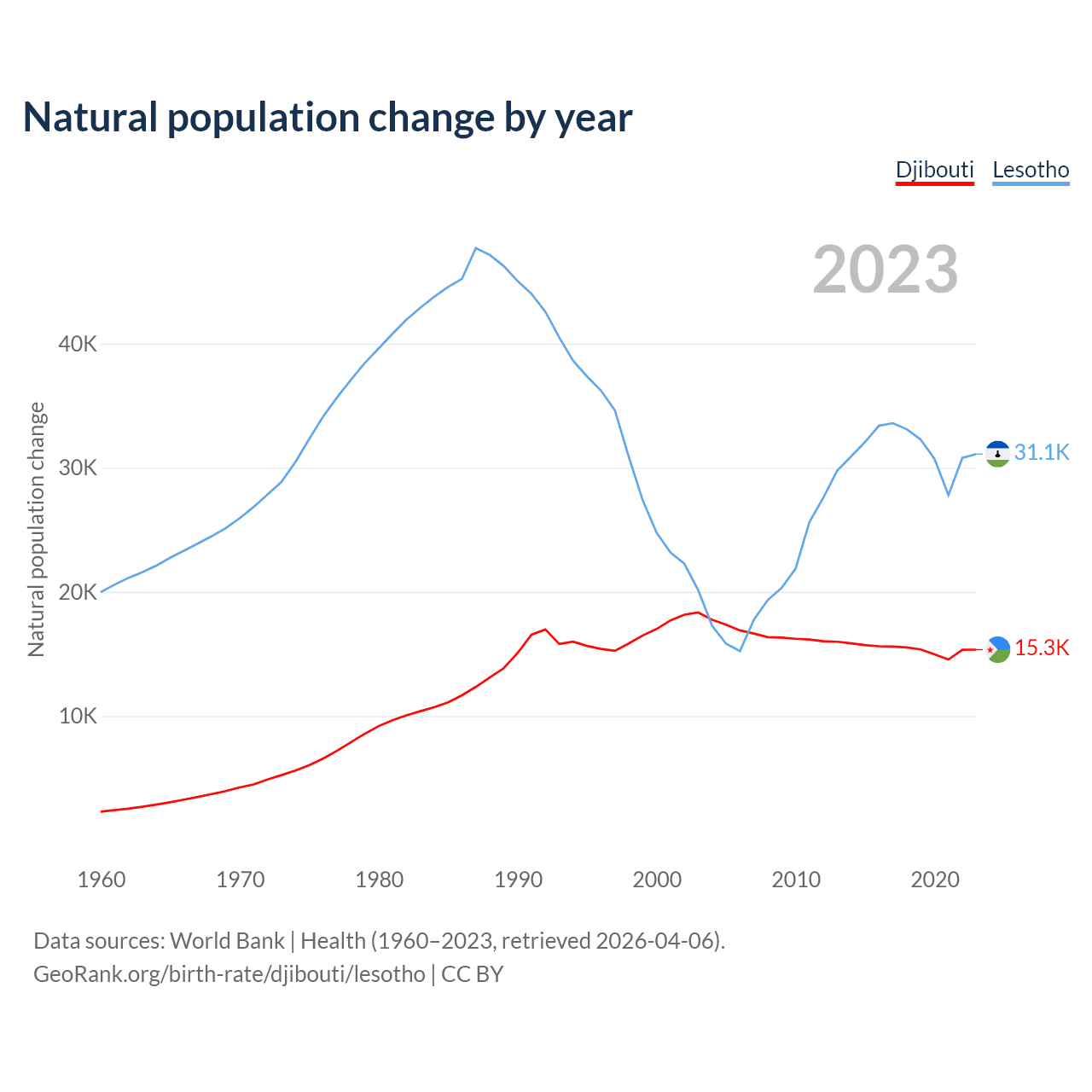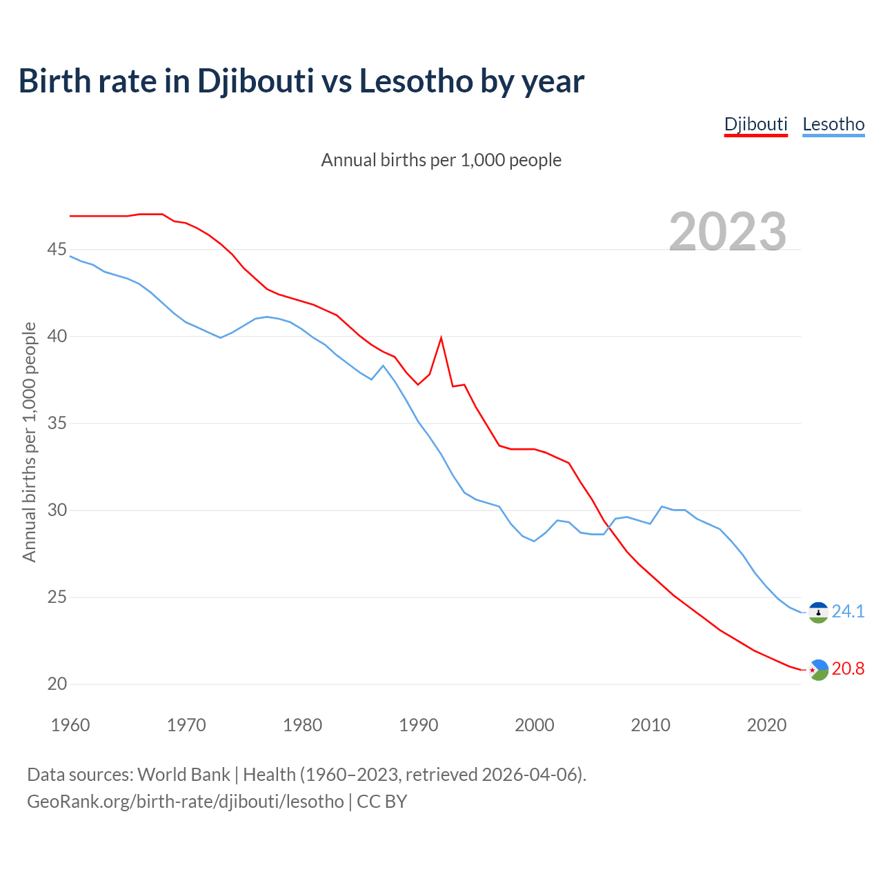 Djibouti has an annual birth rate of 20.8 births per 1,000 people, compared to 24.1 for Lesotho. The average number of children a woman is expected to have during her lifetime — the fertility rate, is 2.61 in Djibouti and 2.69 in Lesotho — 3.26% difference.