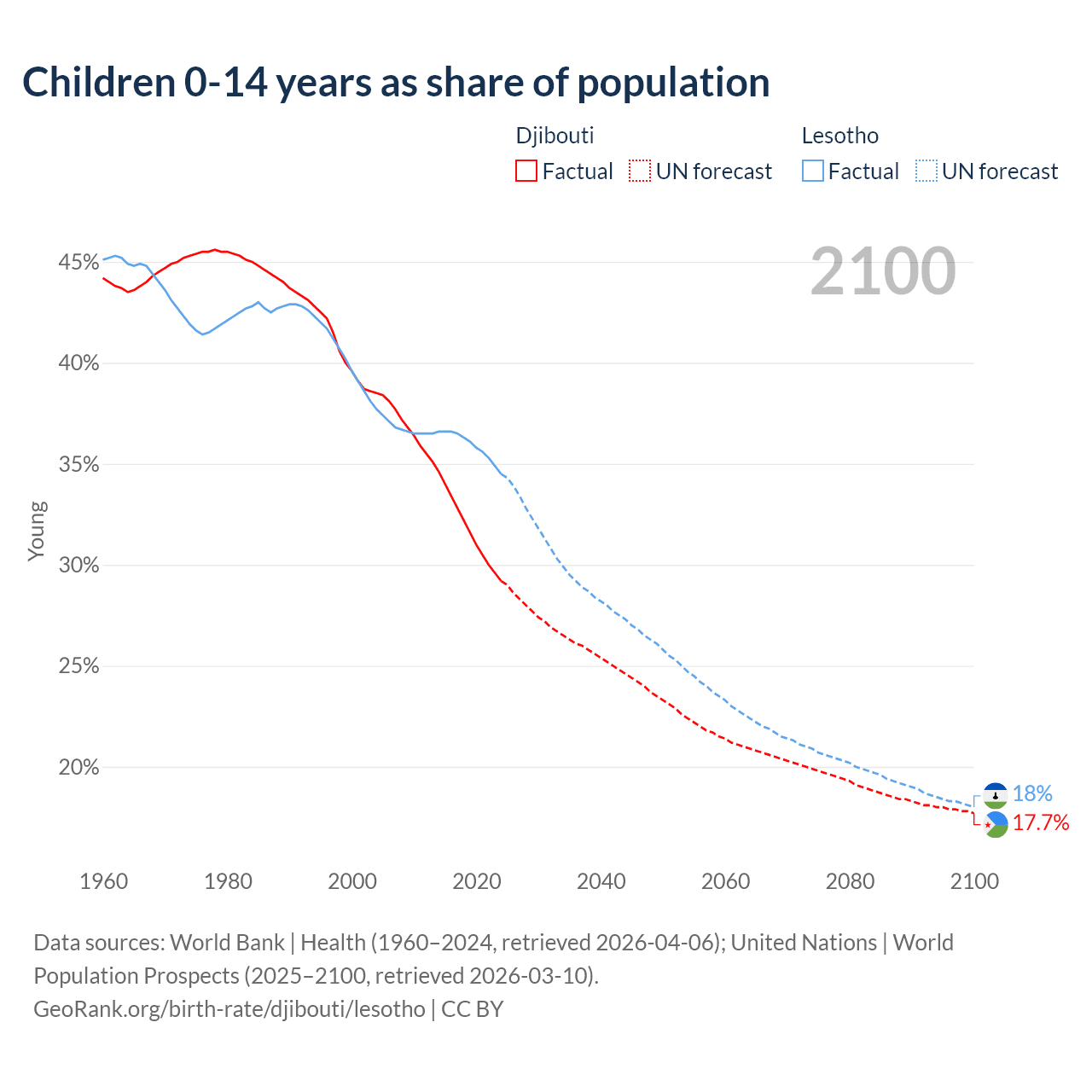 According to the latest available data on birth rates, the fertility rate in Djibouti was 2.61 children per woman in 2023, compared to 2.69 in Lesotho in 2023. The replacement level is considered to be 2.1 children per woman.